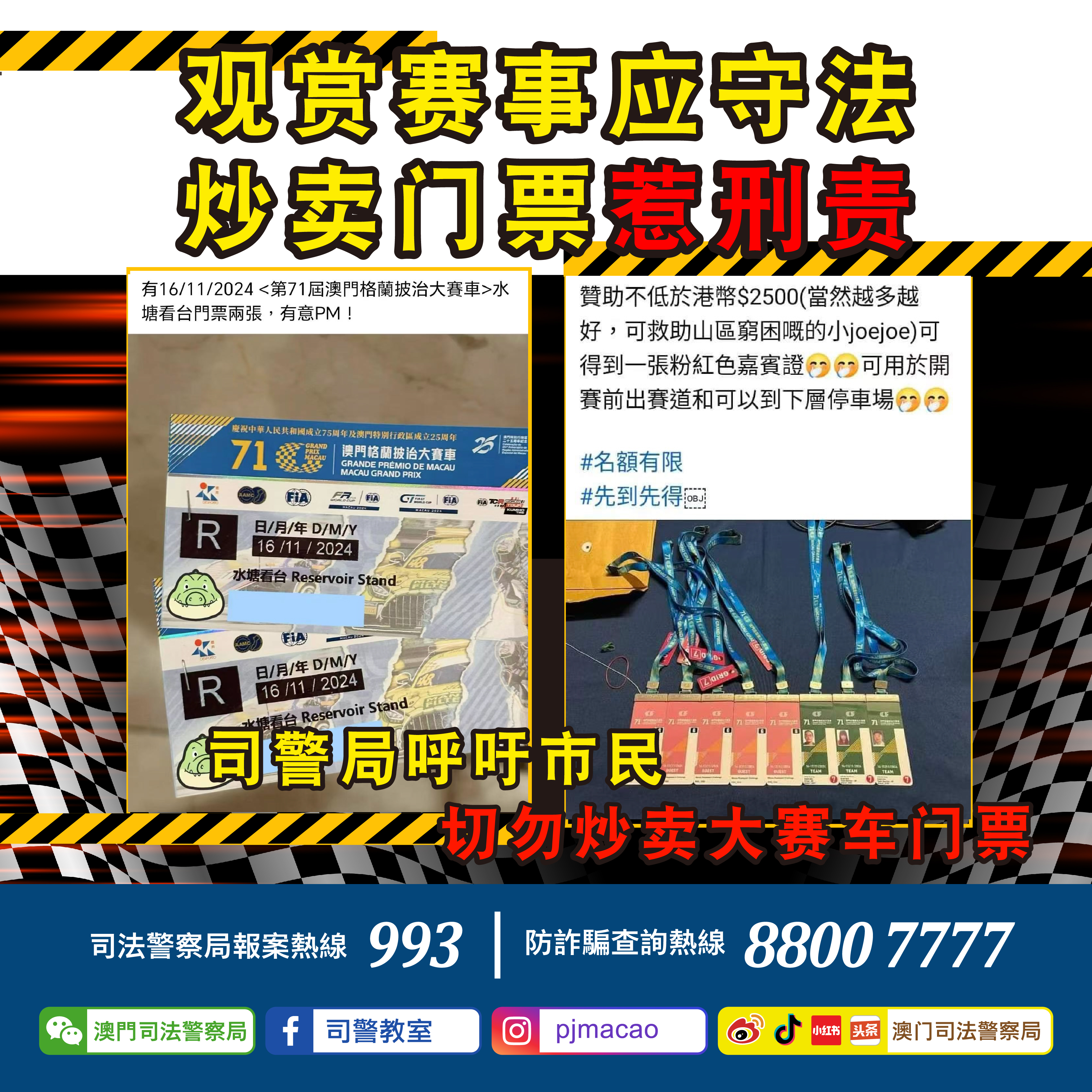 警情通告:观赏赛事应守法 炒卖门票惹刑责 司警局再次呼吁市民切勿炒卖大赛车门票