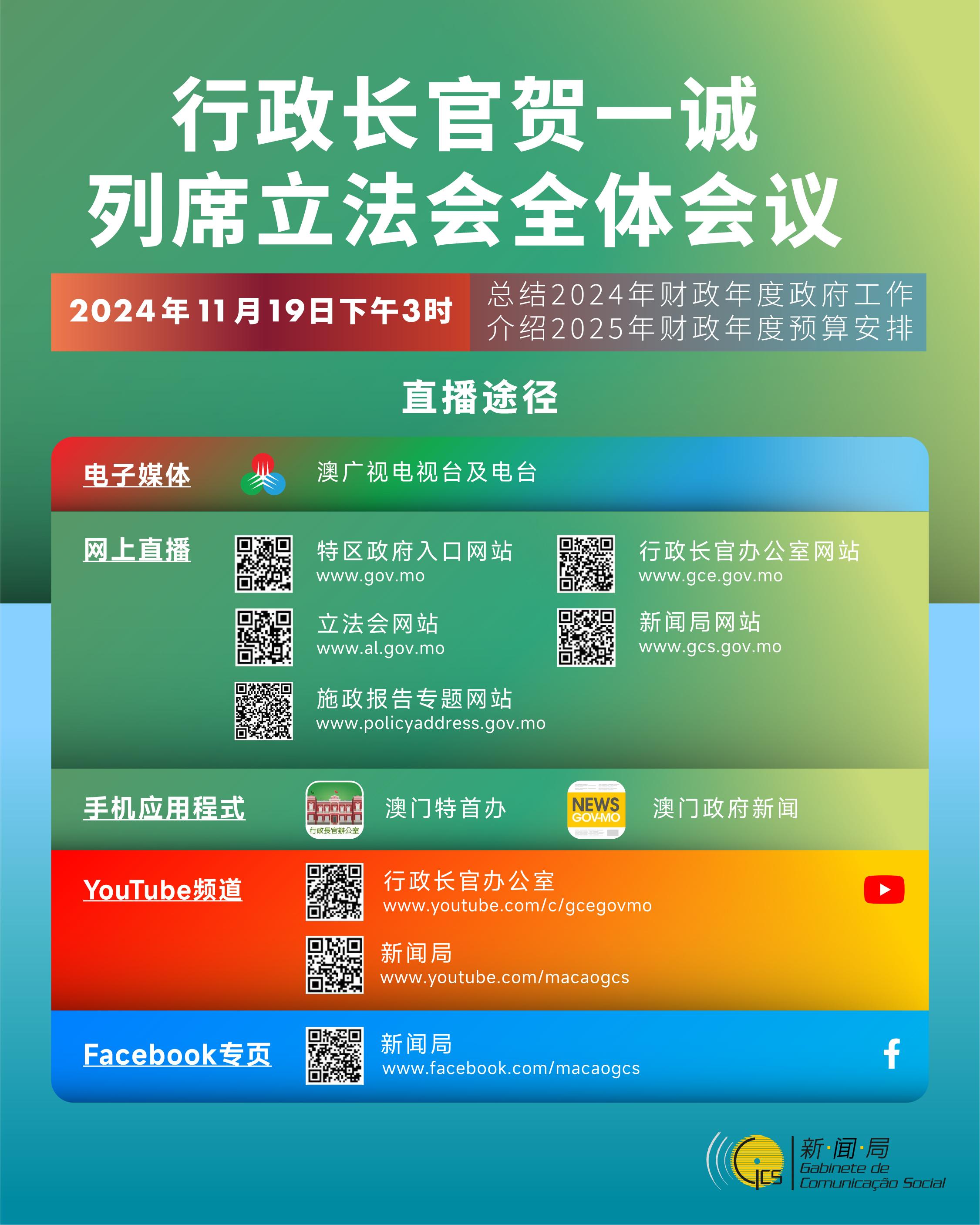 澳广视属下电视台及电台届时将会现场直播。公众亦可透过澳门特别行政区政府入口网站( www.gov.mo ),行政长官办公室 ( www.gce.gov.mo )、立法会( www.al.gov.mo )和新闻局 ( www.gcs.gov.mo )的网站,施政报告专题网站( www.policyaddress.gov.mo ),行政长官办公室(澳门特首办)和新闻局(澳门政府新闻)的手机应用程式、行政长官办公室( www.youtube.com/c/gcegovmo )和新闻局( www.youtube.com/macaogcs )的专属Youtube频道,以及新闻局Facebook专页( www.facebook.com/macaogcs ),观看网上直播。