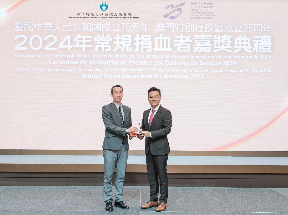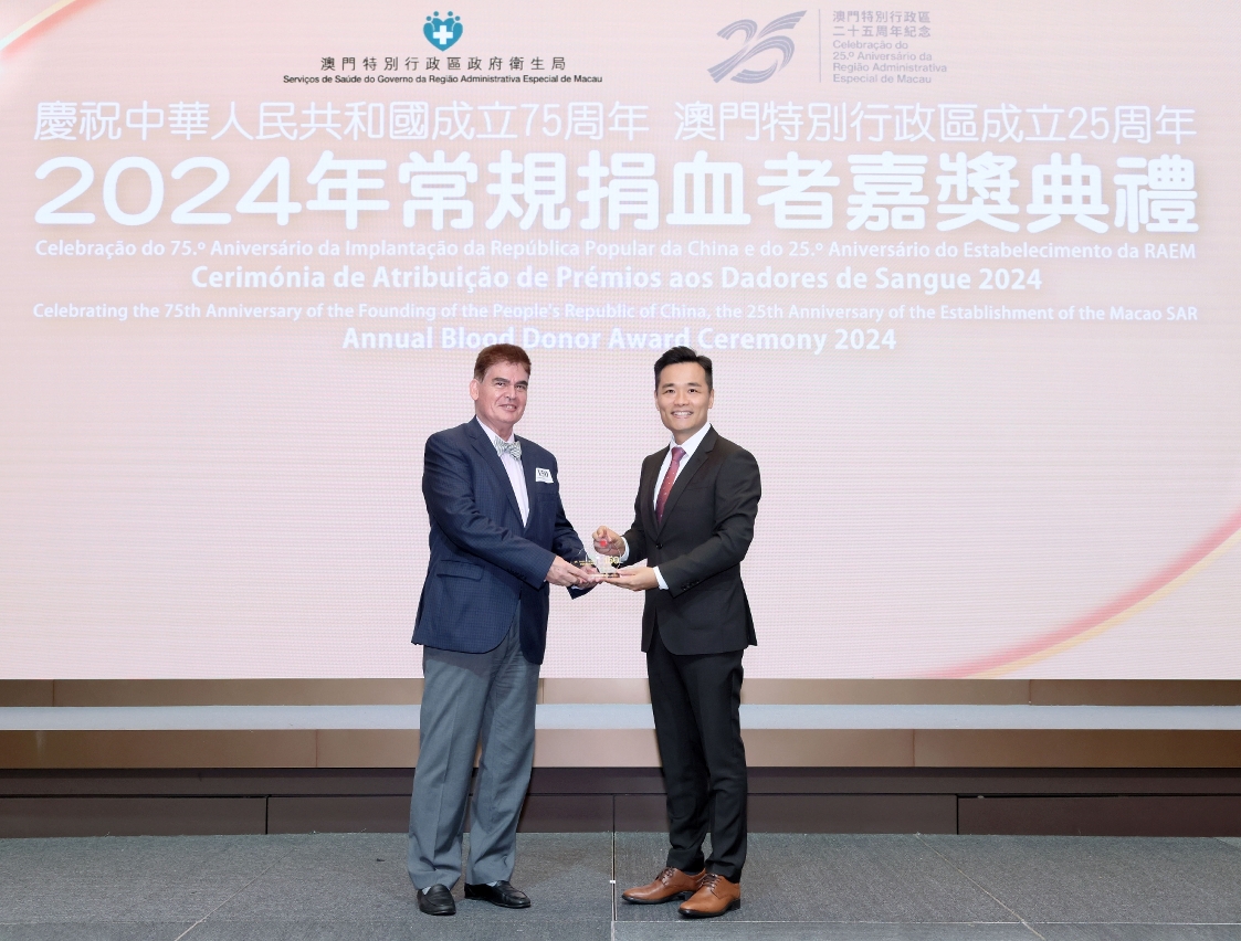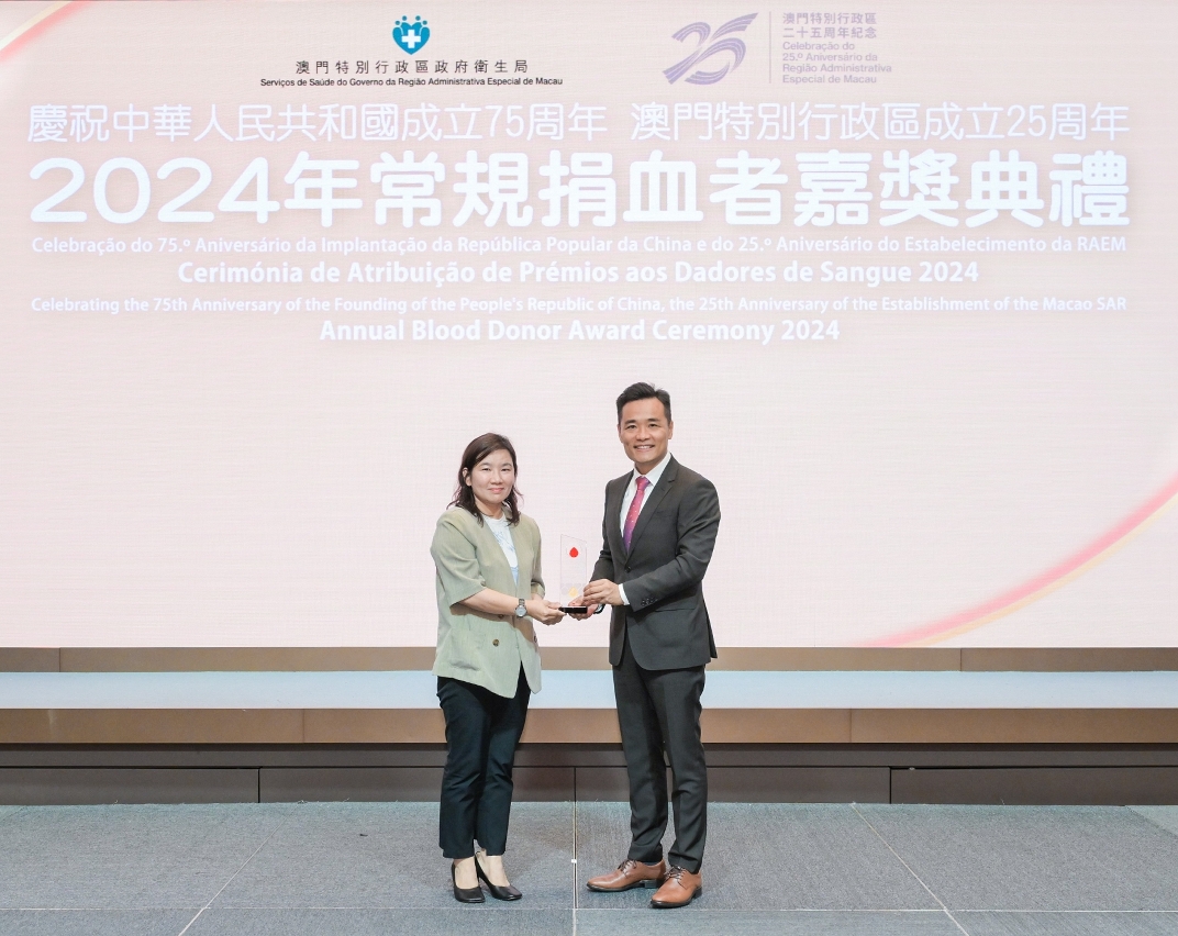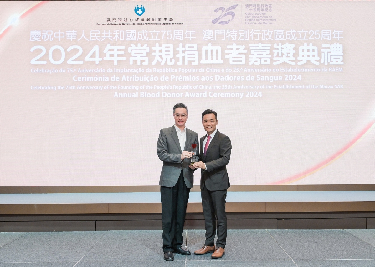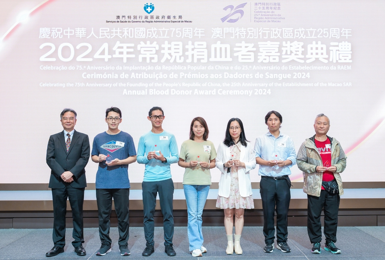 庆祝中华人民共和国成立75周年、澳门特别行政区成立25周年-2024年常规捐血者嘉奬典礼于日前圆满举行。卫生局罗奕龙局长、中国人民解放军驻澳门部队保障部张春栋部长、中央人民政府驻澳门特别行政区联络办公室宣传文化部综合处王惠杰处长等出席了典礼,并向获奖的部门、团体、机构、学校和个人等颁发奬项,以公开表扬无私奉献的捐血者和协助推动捐血的社团和机构,以引起社会共同关注本澳血液需求,鼓励更多居民积极参与捐血活动。
