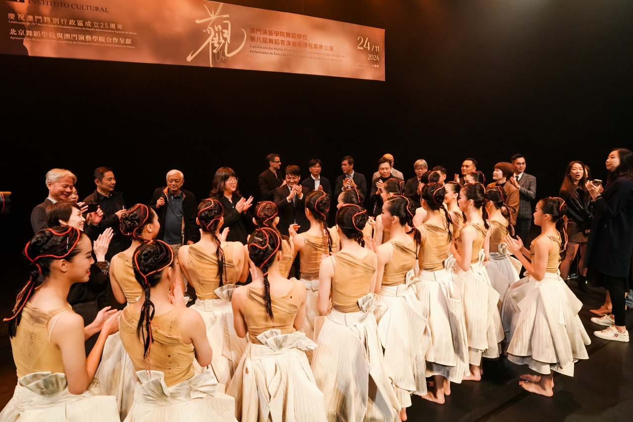 文化局辖下澳门演艺学院舞蹈学校第八届舞蹈艺术表演课程毕业公演,原创舞剧《观》于11月24日在澳门文化中心小剧院圆满上演。中央人民政府驻澳门特别行政区联络办公室宣传文化部副处长徐东杰,文化局澳门演艺学院院长陈理理,教育及青年发展局中学教育处处长梁怡安,上海戏剧学院附属上海舞蹈学校校长吴洁、副校长宁治,中葡职业技术学校校长陈盛畴,以及来自星海音乐学院舞蹈学院、澳门科技大学、澳门文化界联合总会、澳门舞蹈家协会、澳门舞蹈总会等一众嘉宾莅临观赏。