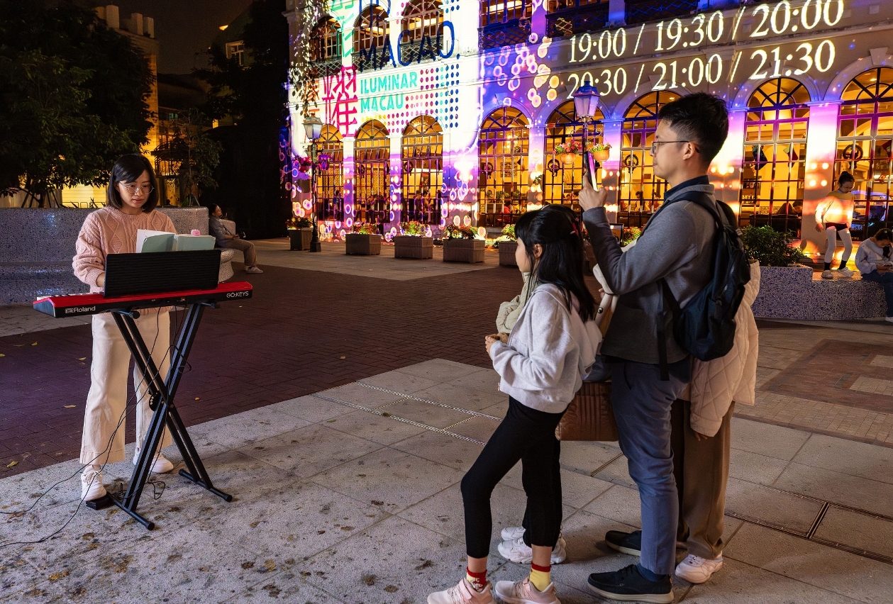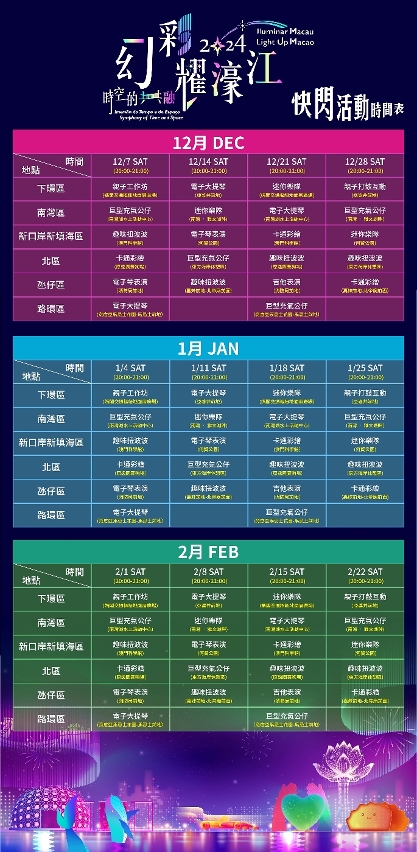 “2024幻彩耀濠江”活动期间逢周六晚上8时至9时,在6区的特定地点将有不同的快闪活动,增加现场欢乐气氛。明天(12月14日)的快闪活动包括:下环区阿婆井前地 – 电子大提琴、南湾区南湾‧雅文湖畔 – 迷你乐队、新口岸新填海区何贤公园 – 电子琴表演、北区东方海岸休憩区 – 巨型充气公仔、氹仔区嘉妹前地(北帝庙前面) – 趣味扭波波。更多快闪活动详情可浏览“2024幻彩耀濠江”网站(https://lum.macaotourism.gov.mo)。