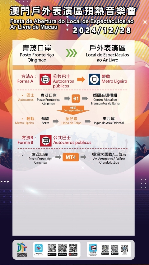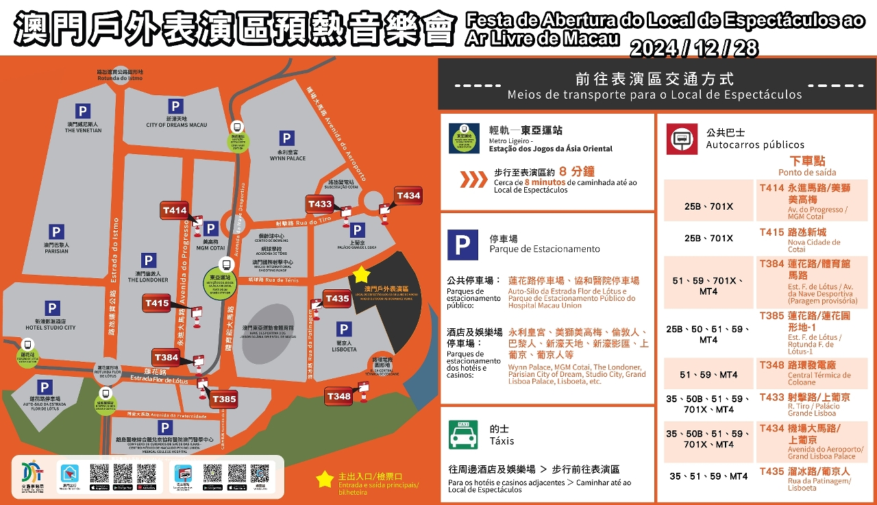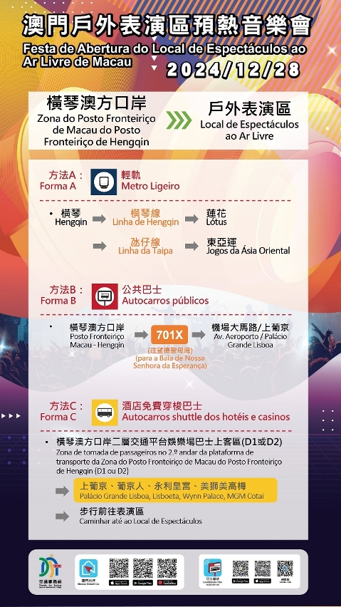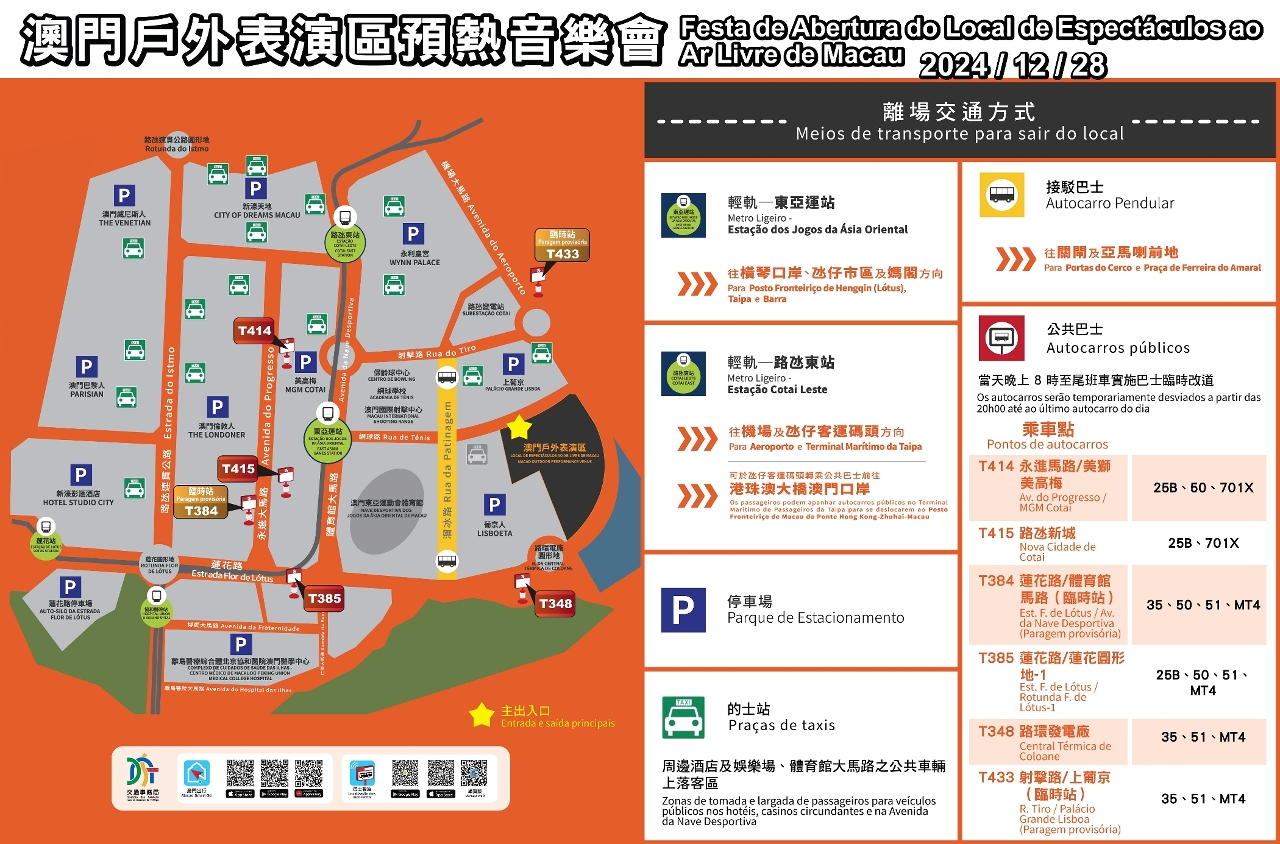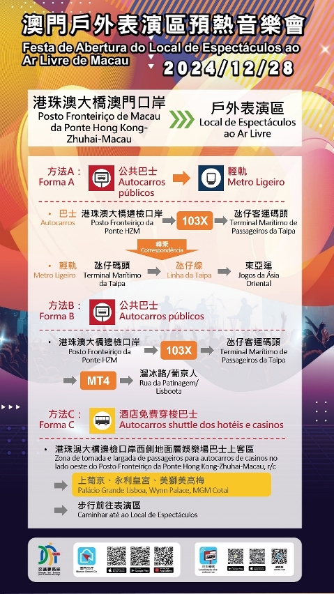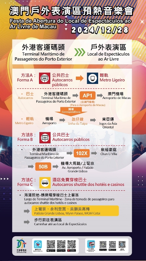 配合音乐会结束后观众离场的出行需要,巴士、轻轨将临时调整服务,以进一步提升运载效率。届时设有两条免费接驳巴士路线,分别前往“亚马喇前地”及“关闸”;轻轨采取分流安排,“东亚运”站前往横琴口岸、氹仔市区及妈阁方向、“路氹东”站则前往机场及氹仔客运码头方向;乘客于氹仔客运码头可转乘巴士103X路线前往港珠澳大桥澳门口岸。此外,观众亦可先步行前往周边娱乐综合体,乘搭的士或博企穿梭巴士离开。建议观众离场时留意现场指示牌及按照工作人员指引,根据目的地方向选择合适的交通工具离开。