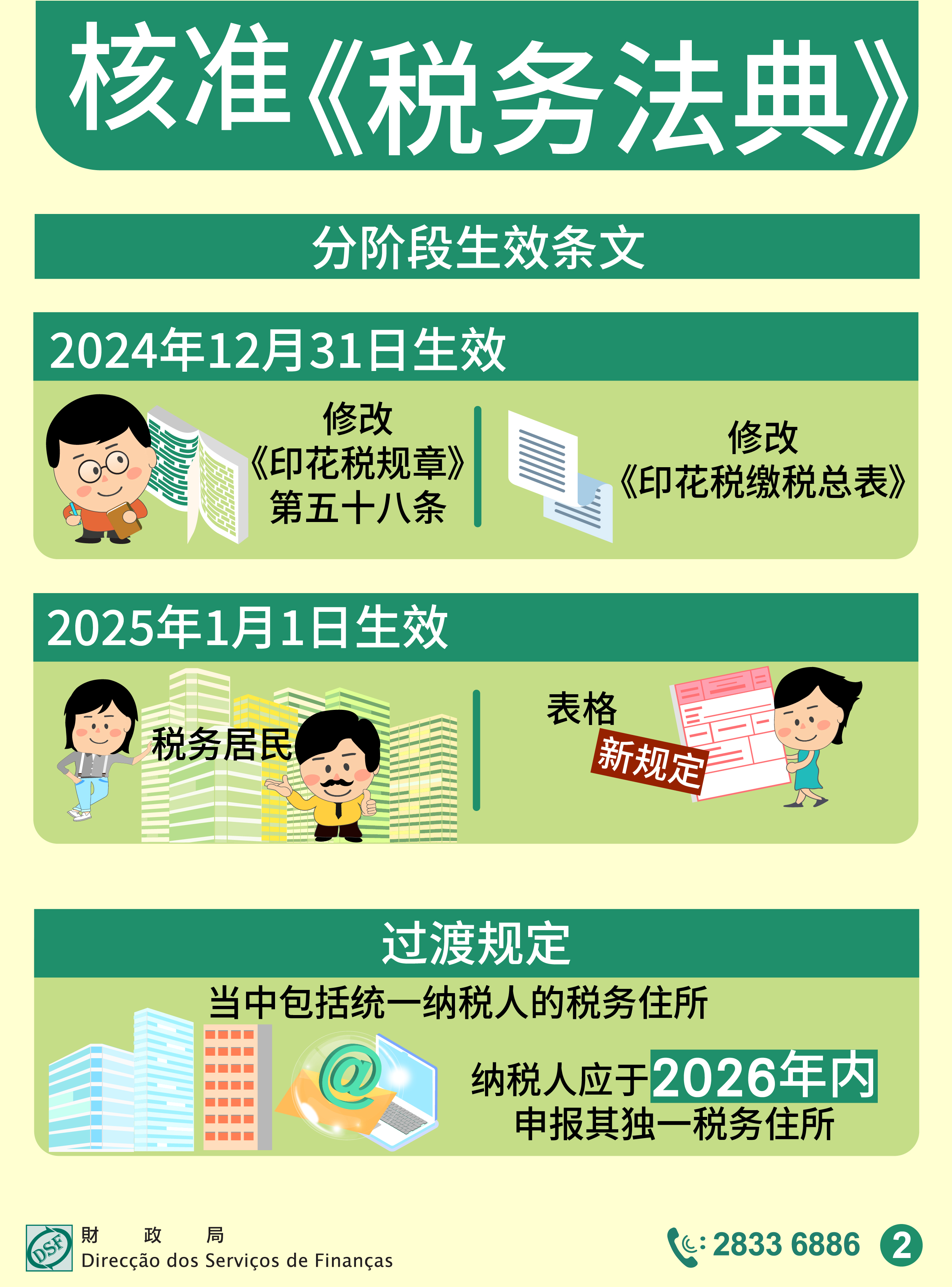 核准《税务法典》自2026年1月1日起全面生效。相关过渡规定,包括统一纳税人的税务住所,自2026年1月1日起计一年内,纳税人应向财政局告知或变更其独一税务住所。