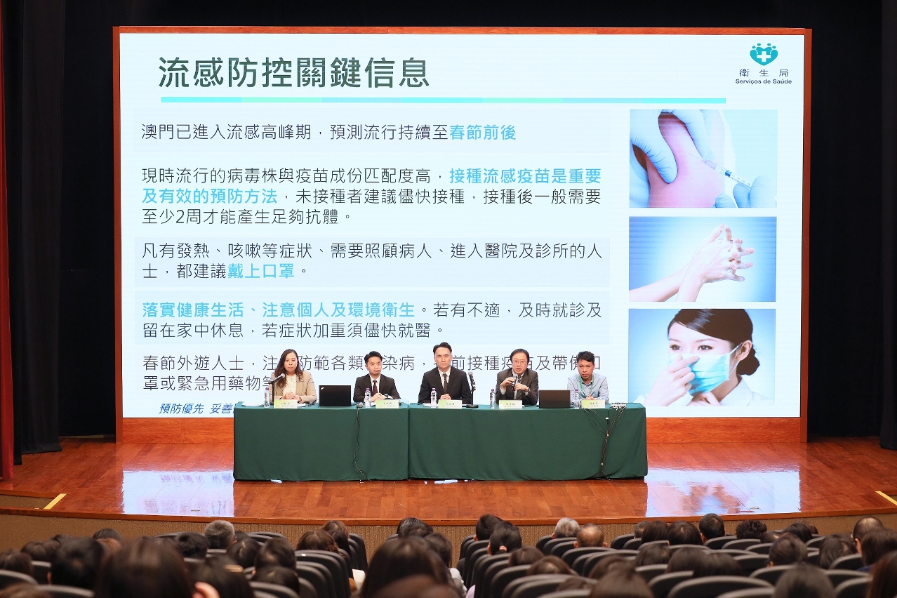 龚志明局长提醒学校须做好校园清洁和预防工作,保持校园环境卫生清洁及空气流通,加强健康教育;积极推动学生和教职员接种流感疫苗,筑起校园的安全屏障,并请学校透过发函,推动仍未接种疫苗但条件合适的学生尽快接种疫苗,倘预约时间于上学时段可予以合理缺勤。曾潭飞医务主任表示,现时本澳接种的流感疫苗与目前流行的流感病毒匹配,接种疫苗可有效预防流感;提醒全澳师生注意个人及环境卫生,若有不适须及时就诊。
