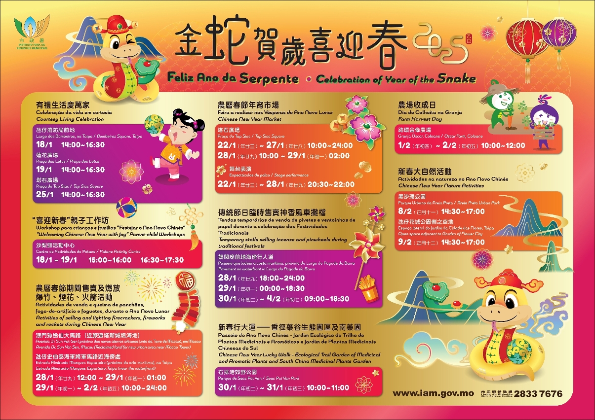 市民及旅客可浏览市政署网页www.iam.gov.mo或致电市民服务热线2833 7676查询,亦可透过微信公众号了解一系列传统贺岁迎春活动。