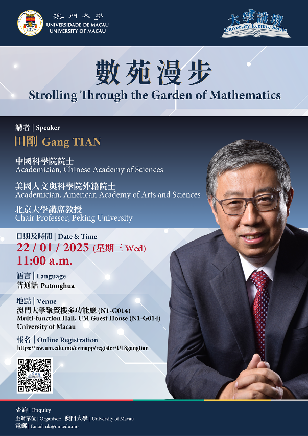 澳门大学将于1月22日(星期三)举办大学讲坛之“数苑漫步”讲座,中国科学院院士、北京大学讲席教授田刚将从数学的抽象性、简洁性、严谨性等角度探讨数学的美妙与智慧。欢迎有兴趣人士参加。