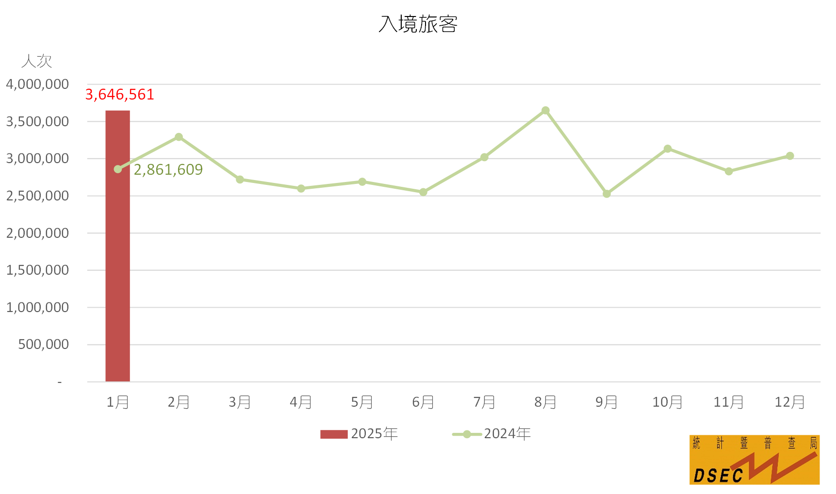统计暨普查局资料显示,2025年1月入境旅客共3,646,561人次,按年上升27.4%。不过夜旅客(2,155,279人次)及留宿旅客(1,491,282人次)同比分别增加45.6%及7.9%。旅客平均逗留时间为1.0日,较去年同期缩短0.2日,主要是不过夜旅客占比按年上升所致;不过夜旅客平均逗留时间(0.3日)增加0.1日,留宿旅客(2.2日)则维持不变。