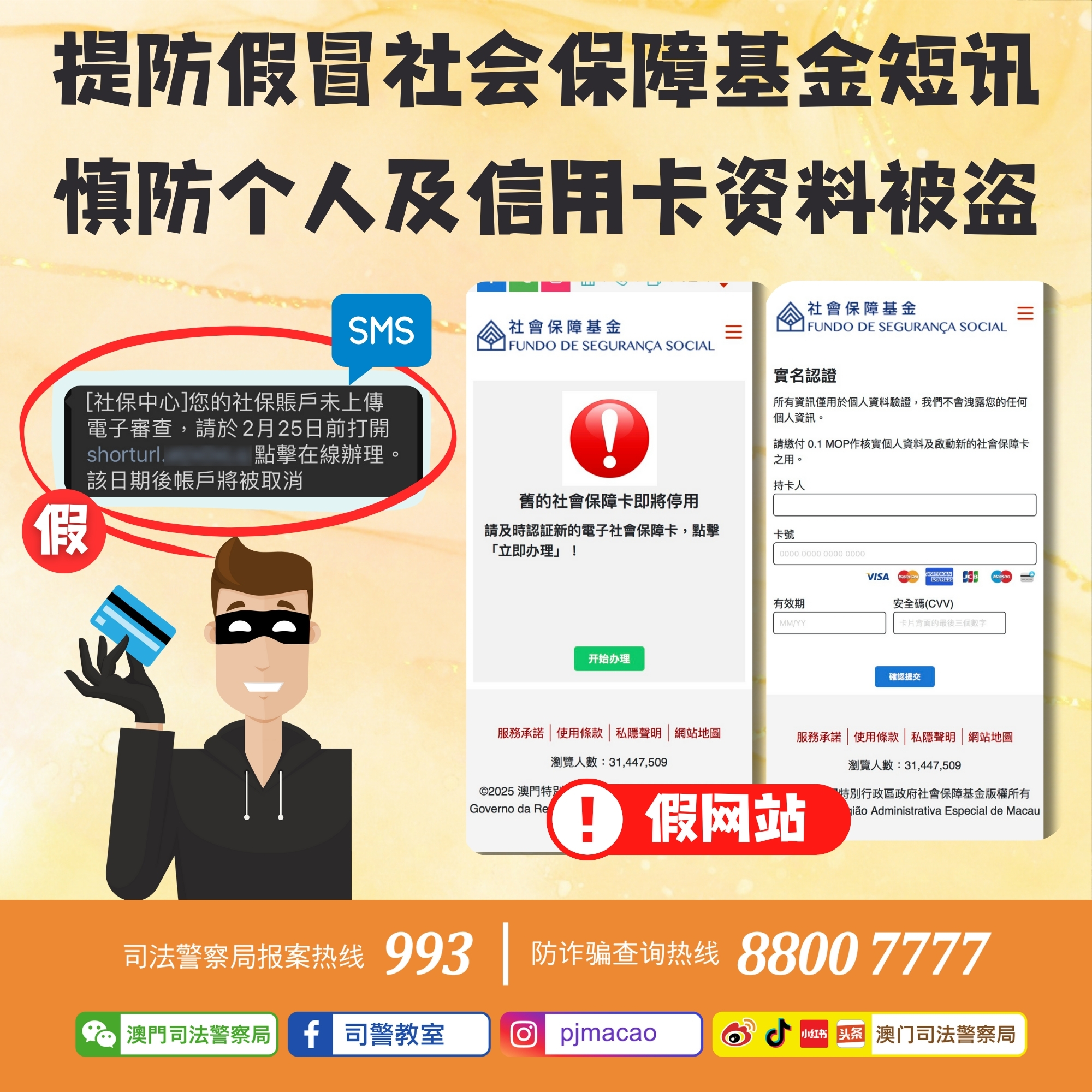 司法警察局今日接获社会保障基金检举,指有人冒充社会保障基金发出钓鱼短讯,内容声称“社保帐户未上传电子审查”,要求市民点击短讯内附带的连结,否则将注销帐户。
