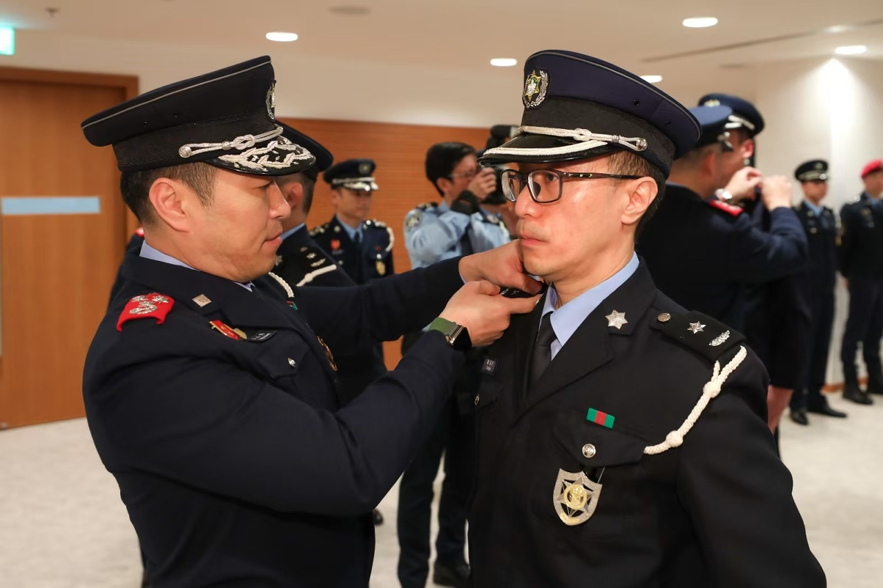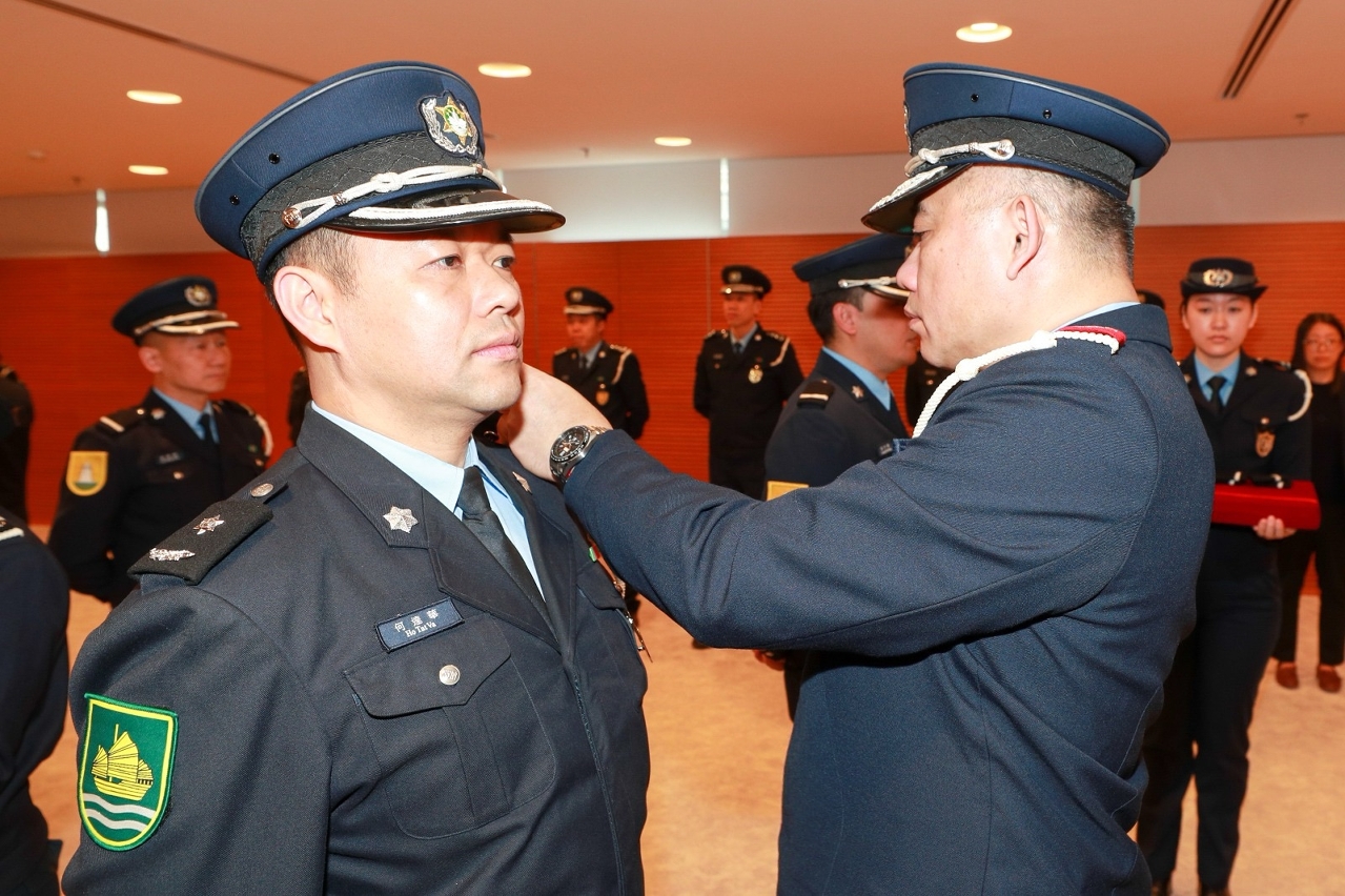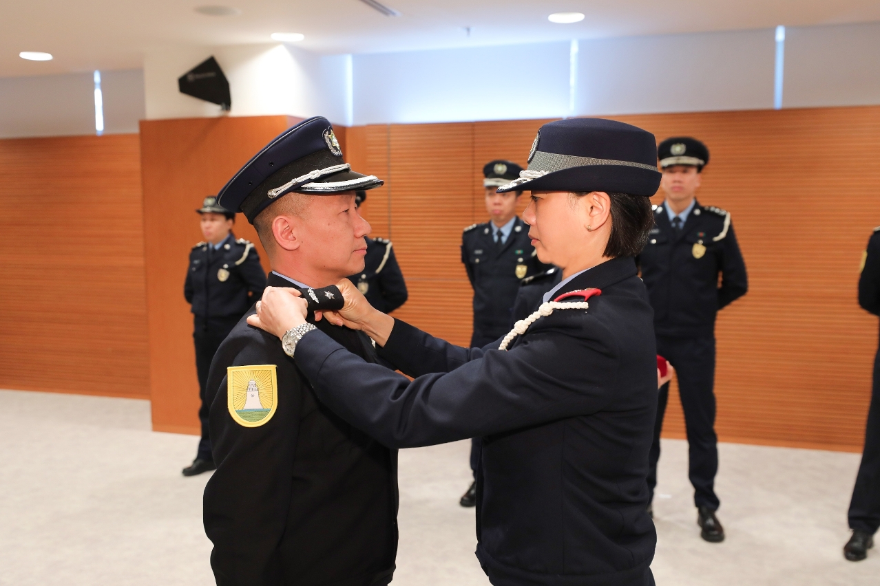 今(28)日上午,治安警察局在总部大楼举行警长晋升仪式,仪式由吴锦华局长主持,黄伟鸿副局长、梁庆康副局长、伍素萍副局长及各部门主管出席仪式。仪式上,各位晋升的警长正式戴上新的肩章,标志着晋升人员肩负起更大的责任与使命。