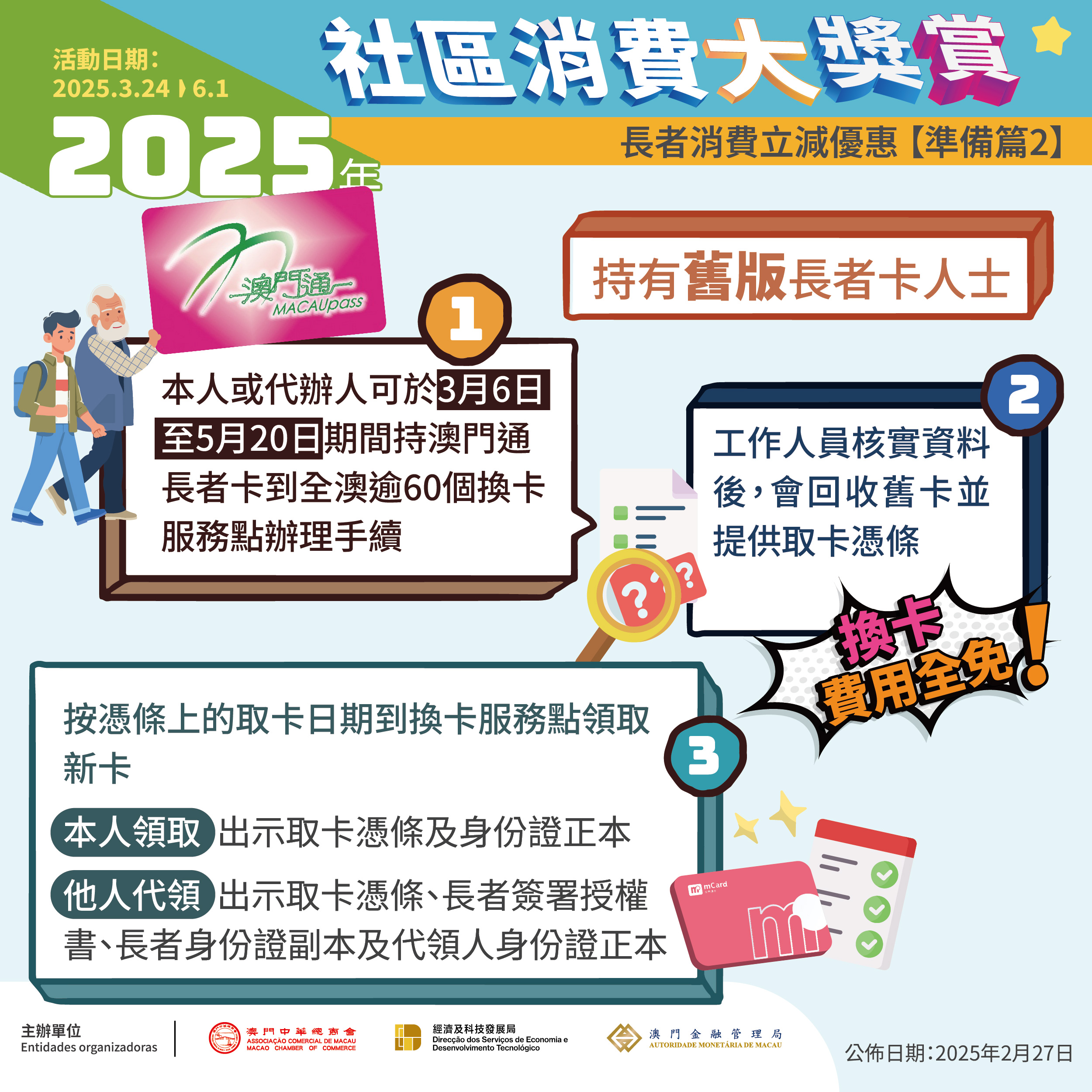 由于旧版“澳门通长者卡”所使用的晶片无法支援拍卡领取立减优惠,为便利长者领取立减优惠,经科局连同社工局协调社服机构和社团,从3月6日起至5月20日期间设置换卡服务点为长者提供辧理免费换卡手续。全澳逾60个换卡服务点已准备就绪,各服务点的地址及服务时间,可查阅活动专页 (http://www.macaospendingrewards.com)。