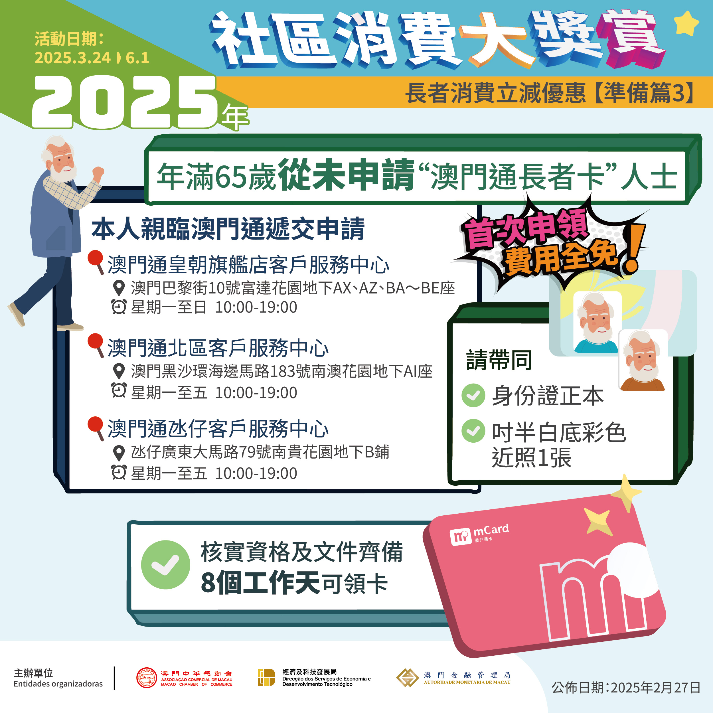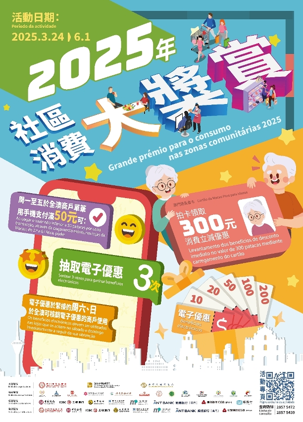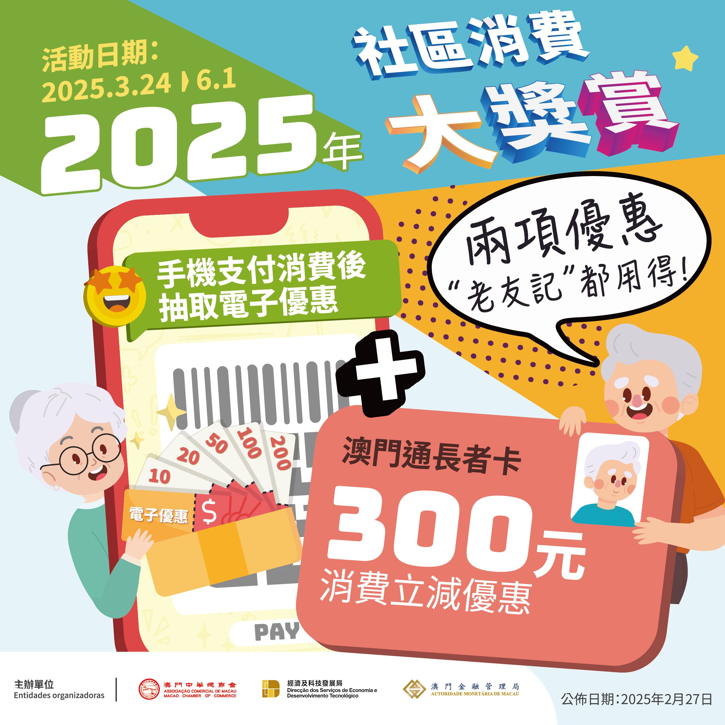 由特区政府与商会合办的“2025年社区消费大奬赏”大型促消费活动将于3月24日至6月1日期间进行。为关顾长者,是次活动在过往手机支付消费后抽取电子优惠的基础上,额外提供“长者消费立减优惠”,年满65岁的长者在活动期间可凭新版“澳门通长者卡”拍卡领取总额300元的消费立减优惠。