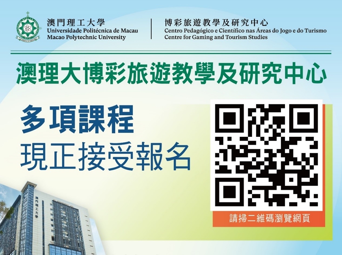 为助力澳门世界休闲旅游中心建设及培育行业人才,澳门理工大学博彩旅游教学及研究中心向公众及从业人员推出新一期系列专业培训课程,欢迎有兴趣人士报读。