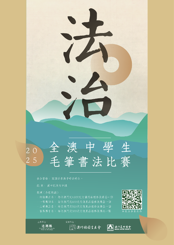 为提升学生对法治的认识与尊重,透过书法艺术承传中国优秀传统文化,由法务局主办、澳门颐园书画会和澳门美术协会协办2025“法治澳门”全澳中学生毛笔书法比赛,有兴趣参赛的学生,可自即日起至2025年4月22日前递交作品。