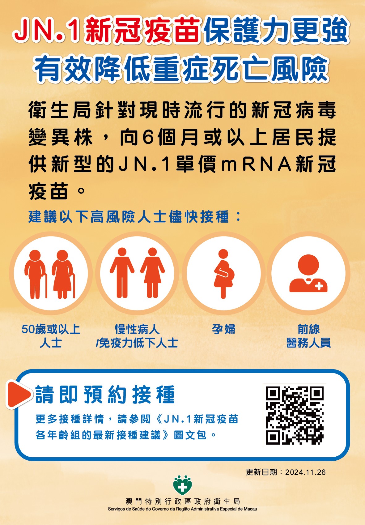 卫生局表示,春季是呼吸道传染病的好发季节,本澳现时新冠病毒持续活跃,呼吁居民加强注意防范,尤其高风险人士包括长者、患有严重慢性基础病、免疫力低下的人士应尽快完成接种JN.1新冠疫苗,感染后尽早就医使用抗病毒药物治疗,同时呼吁居民加强注意个人卫生,若有发烧、咳嗽等呼吸道症状时,身体抵抗力便会下降,外出时应佩戴口罩,以预防重迭感染其他呼吸道传染病,避免病情加重,并可减少疾病传播。