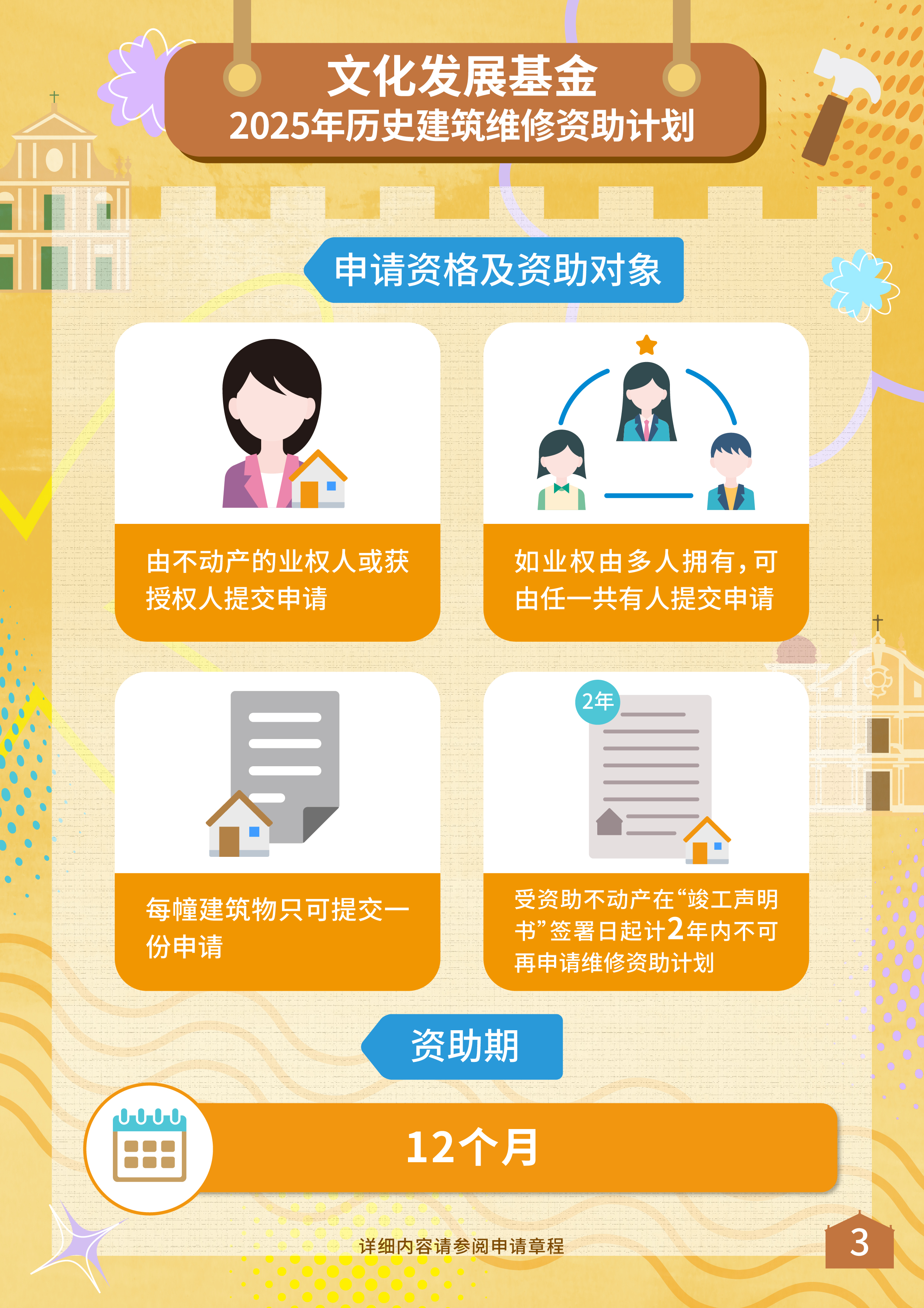 “历史建筑维修资助计划”今年将推出两轮申请,第一轮申请期由2025年3月31日至5月30日,第二轮申请期则由9月15日至11月14日。资助范围包括在申请期开始前尚未开展维修工程的被评定、待评定的不动产及具文化价值的不动产,并须由不动产的业权人或获授权人提交申请,如业权由多人拥有,可由任一共有人提交申请。