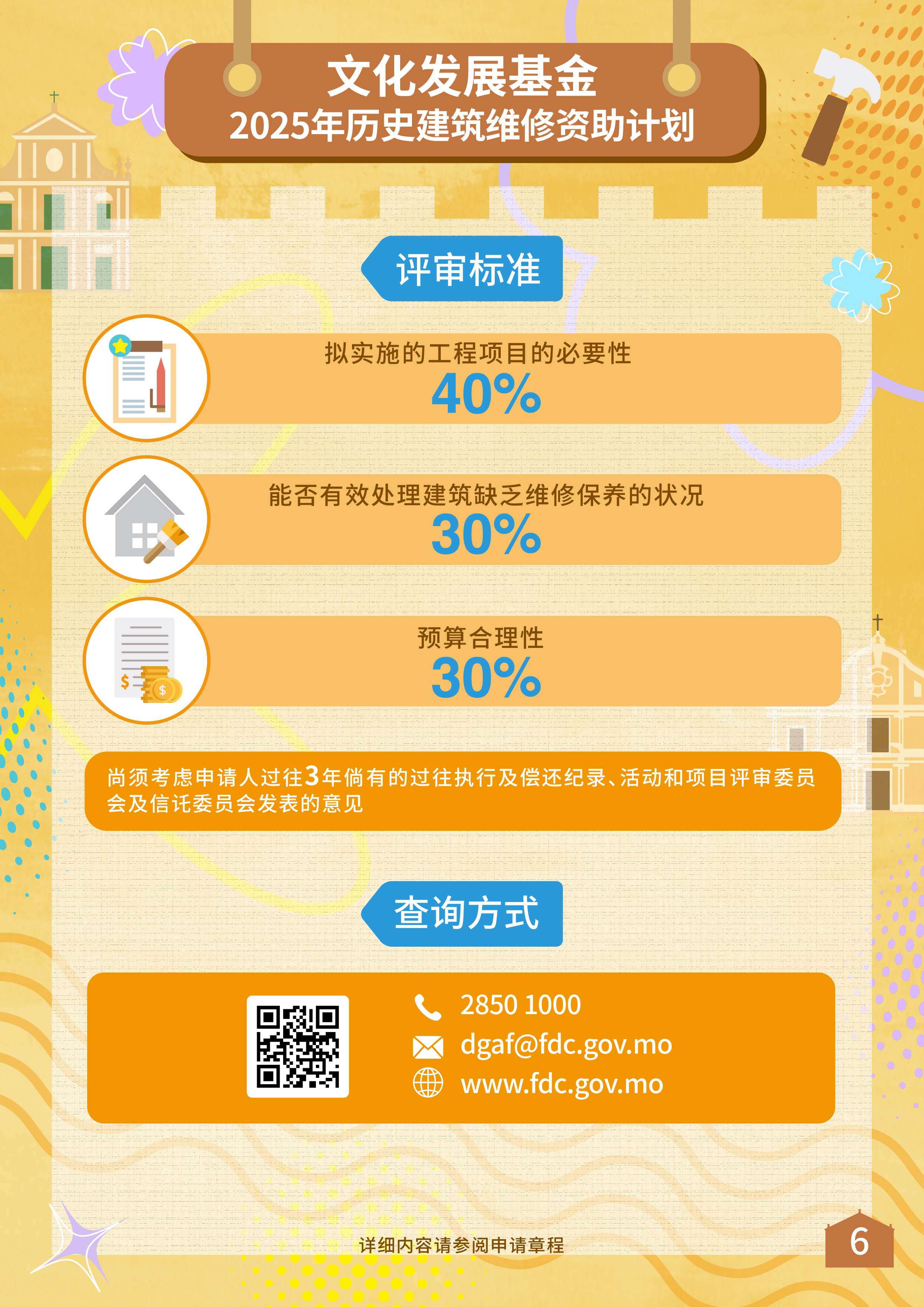 为详细介绍“历史建筑维修资助计划”的申请事宜及解答申请人问题,基金将于4月8日下午3时假诚丰商业中心7楼演讲厅(地址:澳门宋玉生广场322-362号)举行专场讲解会,有兴趣人士请于基金网站(www.fdc.gov.mo)报名,查询请致电2850 1000或电邮dgaf@fdc.gov.mo。