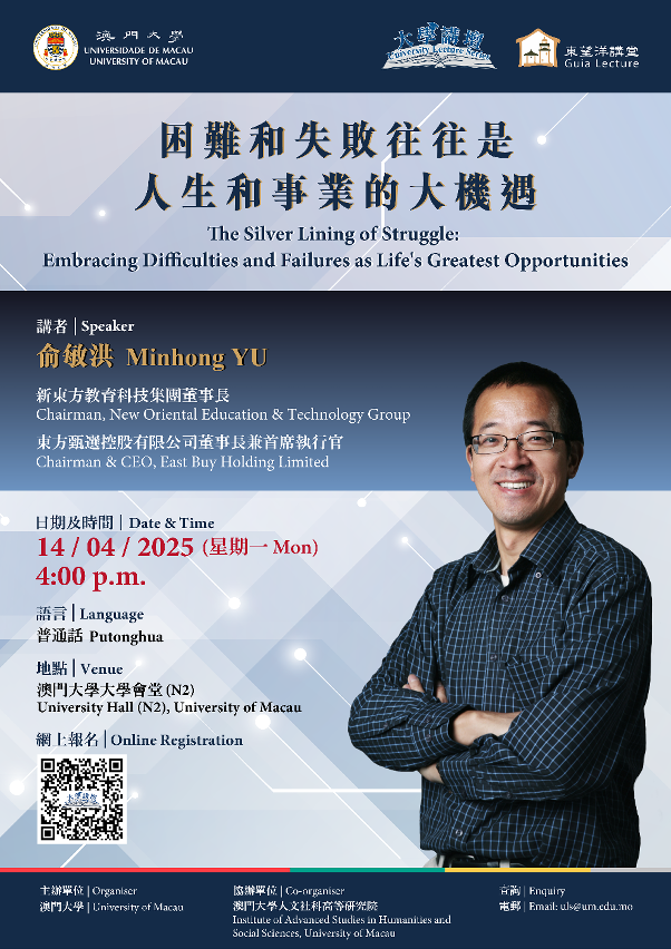 澳门大学将于4月14日(星期一)举办大学讲坛暨东望洋讲堂,新东方教育科技集团董事长、东方甄选控股有限公司董事长兼首席执行官俞敏洪将以“困难和失败往往是人生和事业的大机遇”为题主讲,分享自身经历,深入剖析如何将挑战转化为成长动力。欢迎有兴趣人士参加。