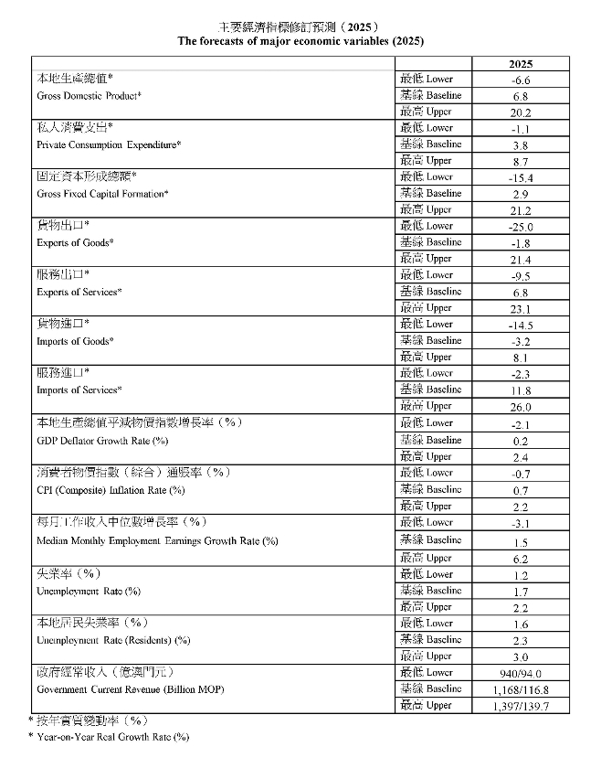 • 澳门本地生产总值增长的基线预测为6.8%。