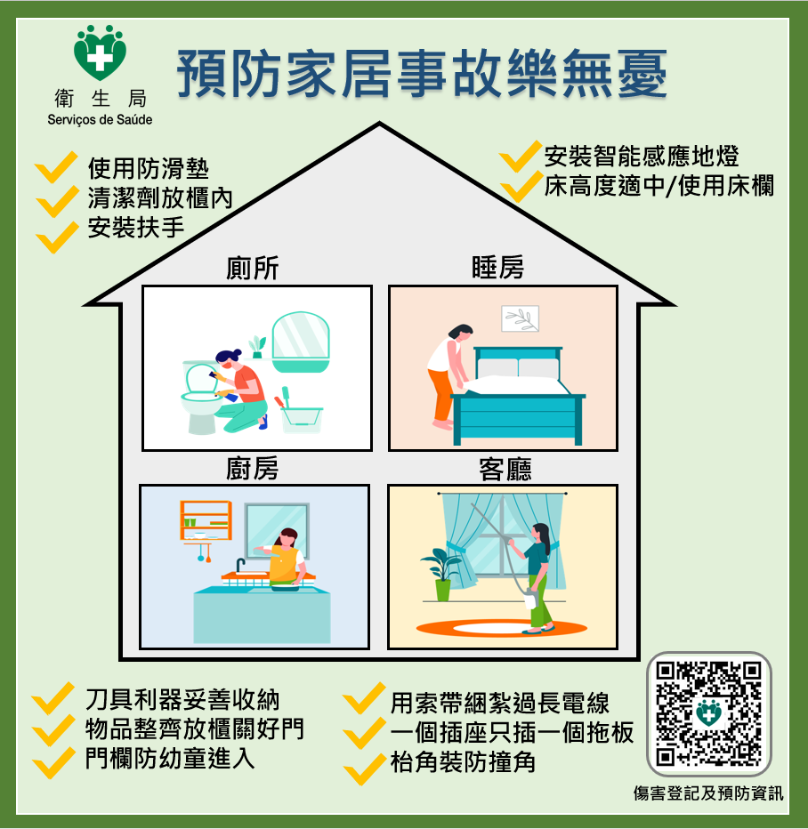 根据本澳地区伤害监测系统显示,本澳近年来伤害发生率最高的场所是居住场所,每年收到接近4,000宗家居伤害事故申报,伤者主要为婴幼儿及长者,成因为跌倒/跌落、被物体击伤及切割伤等为主,当中每年均有部分家居意外伤者需要手术或住院治疗,甚至有个别个案伤重死亡。
