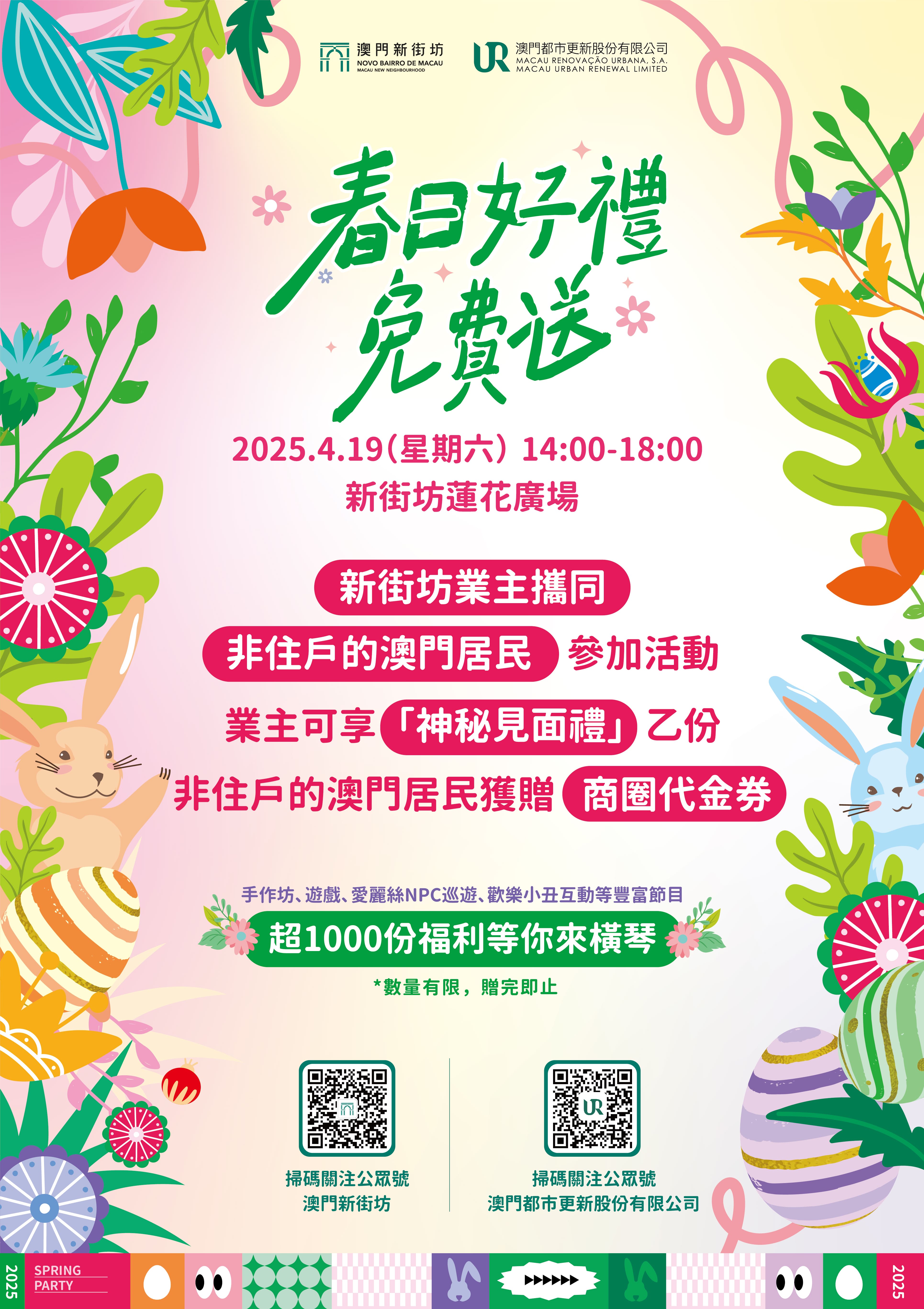 适逢复活节连假,横琴「澳门新街坊」将于4月19日(周六)下午2时至6时在新街坊莲花广场举办「春日奇趣派对」,现场安排多项手作坊、游戏摊位以及精彩演出等互动节目,为澳门居民打造一场充满欢乐与温馨的春日盛会,欢迎广大市民前来感受澳门新街坊浓厚气氛。