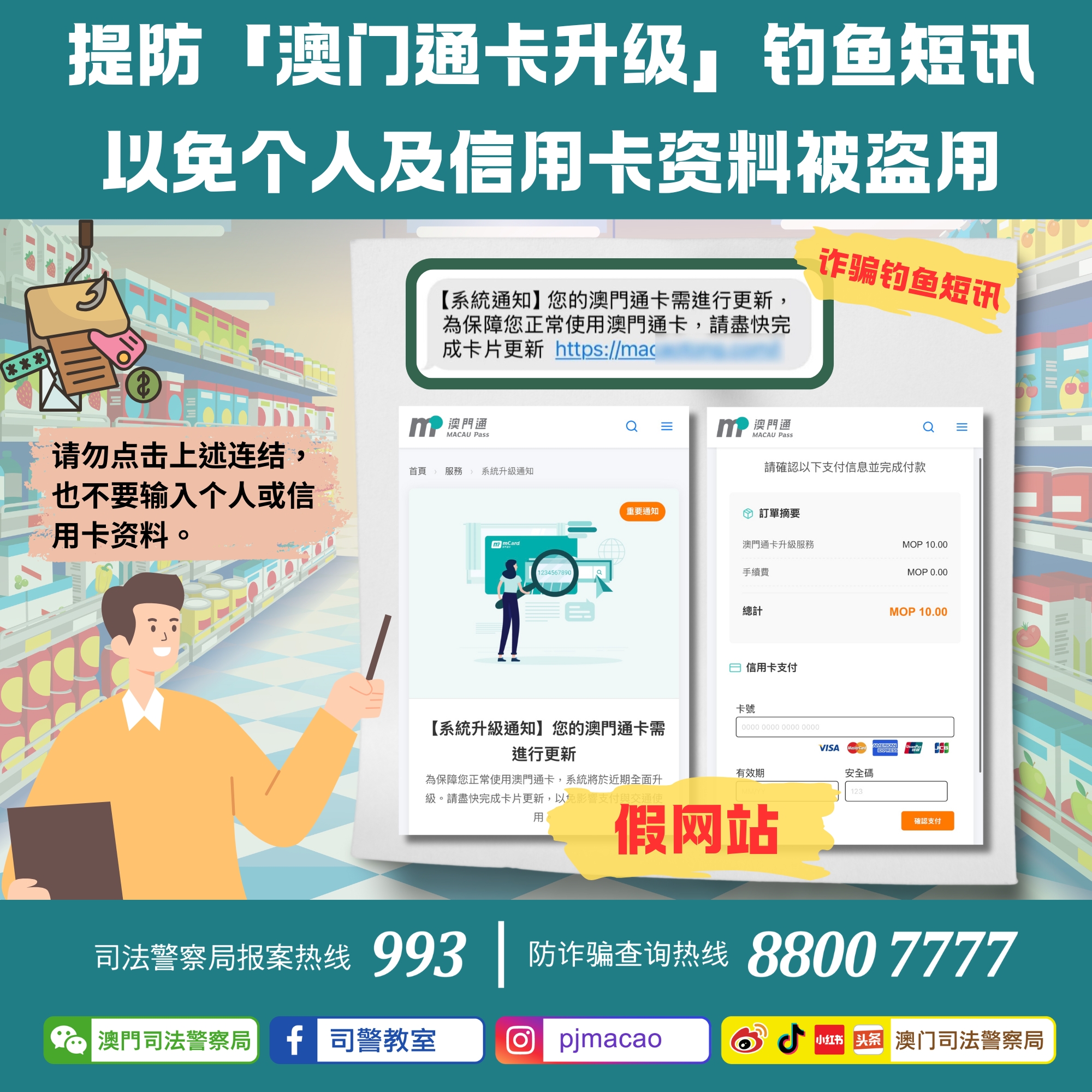 经本局调查,发现若市民点撃,会进入一个假冒「澳门通」的钓鱼网站,该网站会要求市民填写姓名、手机号码、身份证等个人资讯,并要求输入信用卡卡号、有效期及安全码等资料以支付10元的「澳门通卡升级费用」。骗徒在成功盗取相关资料后,利用这些资料进行未经授权的大额交易。