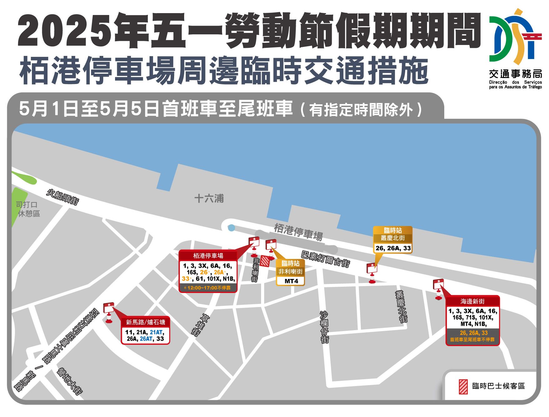 巴士方面,关闸广场东侧、新马路及周边区域、氹仔旧城区参考过往节假日分流方案实施临时措施;两间巴士公司因应假日增加服务班次,并于5月1至5日营运时节性路线3BX、17T、21AT、26AT及101X特班车(101XS)路线,以加快疏导乘客;配合有关安排,周边道路需实施临时交通管制措施。上述相关巴士路线临时调整详情,可参阅附表或浏览两巴网站(澳巴:www.tcm.com.mo、新福利:www.transmac.com.mo)。