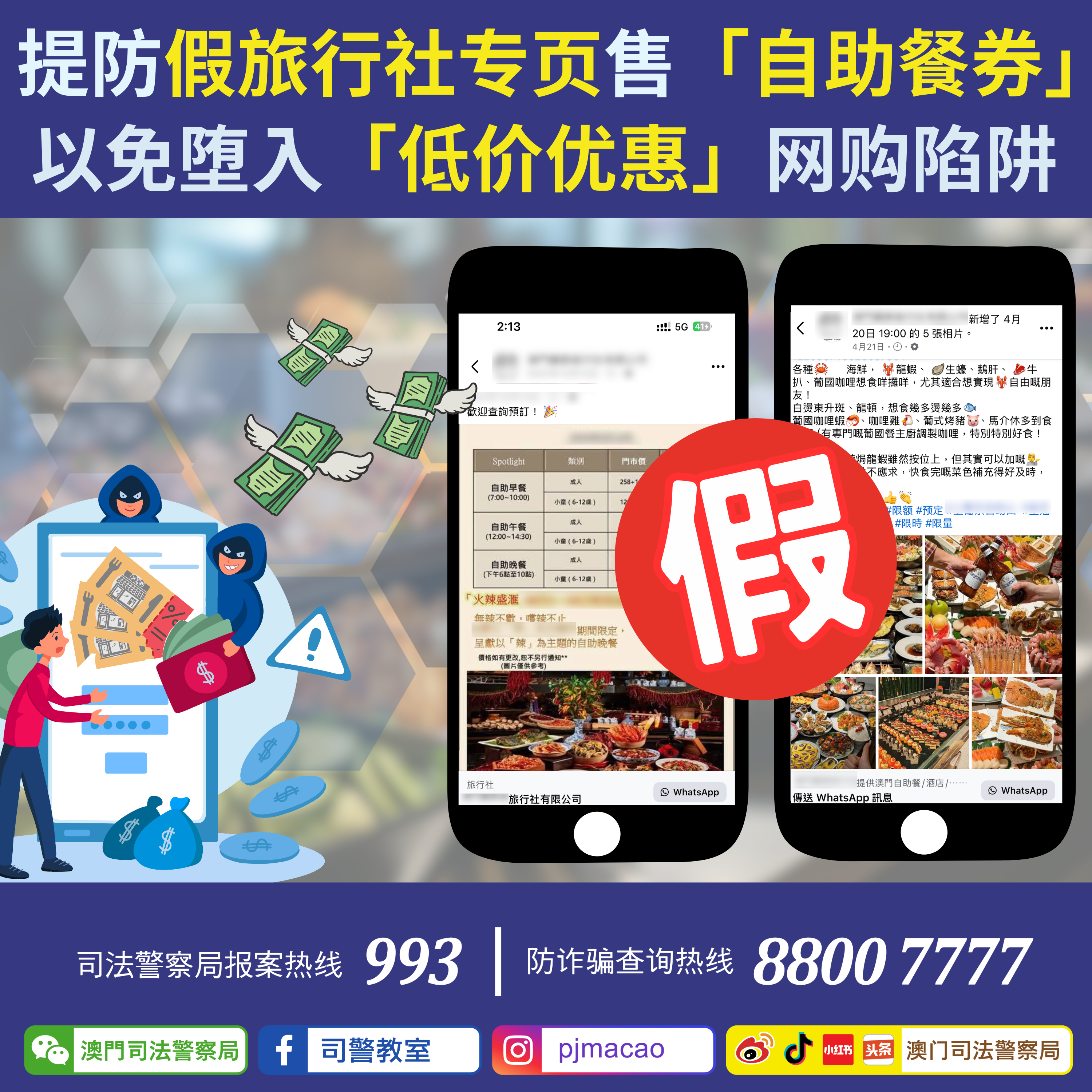 2025年4月上旬,司法警察局发现有骗徒在网上社交平台上冒充本澳多间旅行社的名义,开设虚假专页进行诈骗。司警局随即发出警情通告,提醒市民提高警惕,避免堕入骗局。然而,近日仍有多名市民向司警局举报,称遭遇类似手法的诈骗。