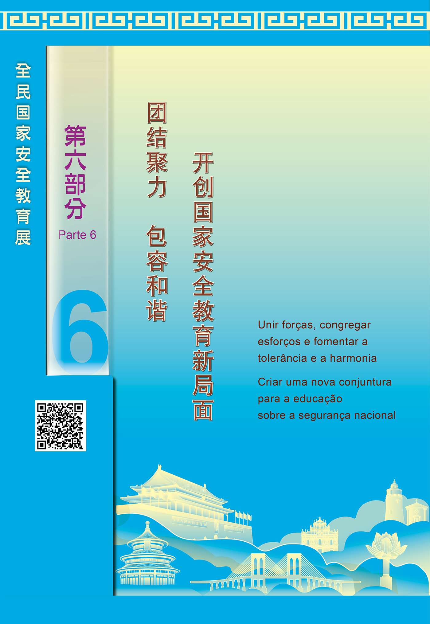 展览的第六部分为“团结聚力 包容和谐 开创国家安全教育新局面”。自2018年起,特区政府与澳门中联办连续八次举办“全民国家安全教育展”,观展人次屡创新高,澳门居民维护国家安全的意识和责任感不断提升,初步形成了国家安全“人人有责、人人尽责、人人可为”的良好社会氛围。中央驻澳机构、特区政府坚持以总体国家安全观为引领,贯彻落实习近平主席关于加强国家安全教育的重要指示精神,联同社会各界广泛开展各类型国安宣教工作,国家安全意识深入民心,在澳门落地生根。