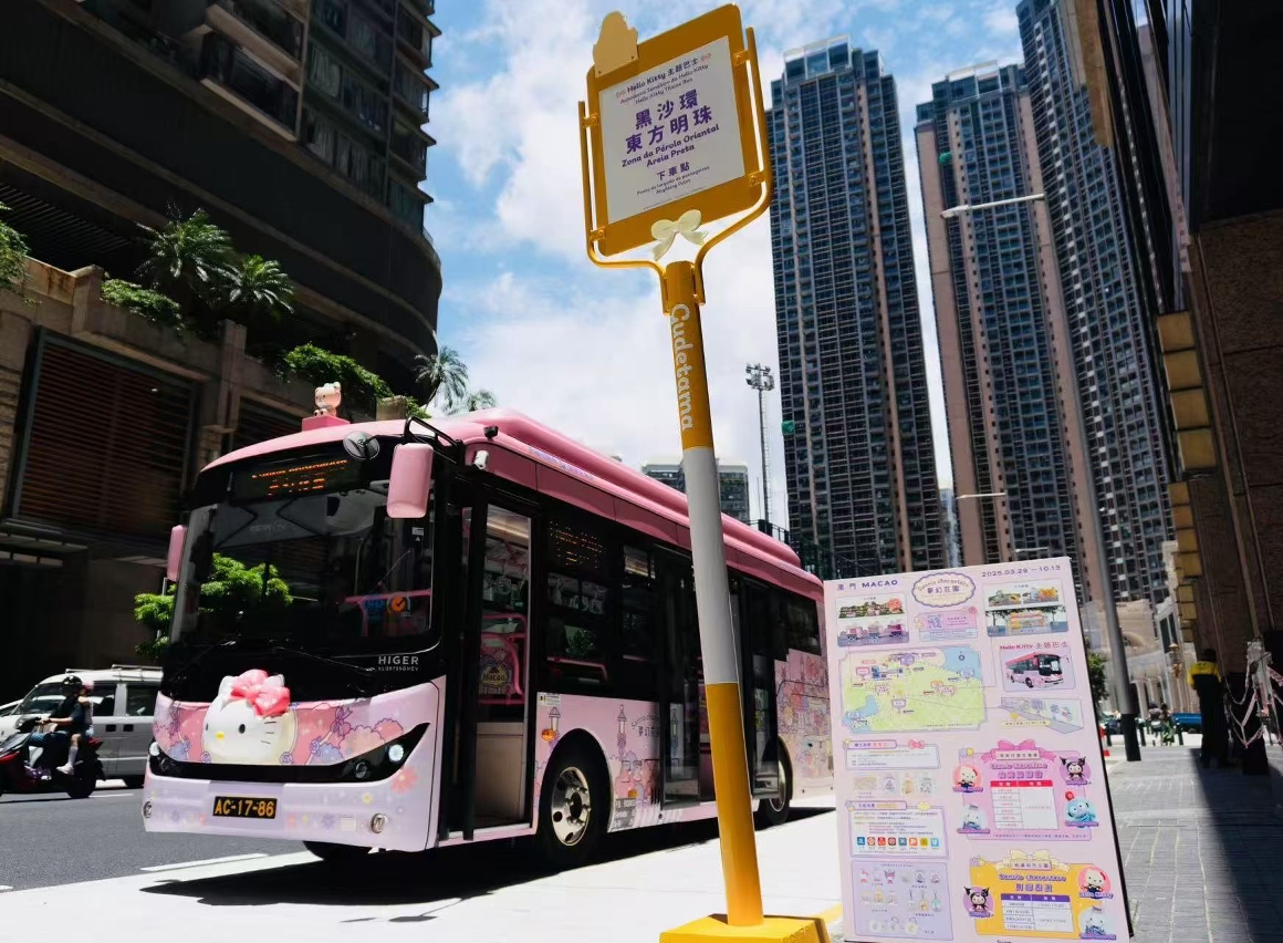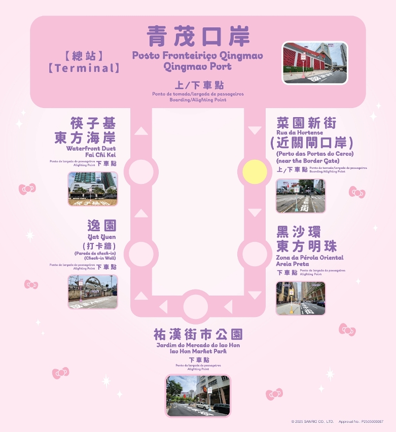 Hello Kitty主题巴士首次登陆澳门北区,巴士车身、座椅、扶手等融入了丰富的Hello Kitty元素,让每位乘客都能感受到Sanrio characters梦幻花园的氛围和独特魅力。主题巴士将从青茂口岸或关闸口岸出发,在北区循环行驶,沿线设有六个下车站点︰菜园新街(近关闸口岸)、黑沙环东方明珠、佑汉街市公园、逸园、筷子基东方海岸及青茂口岸,串联北区各处景点及商圈。