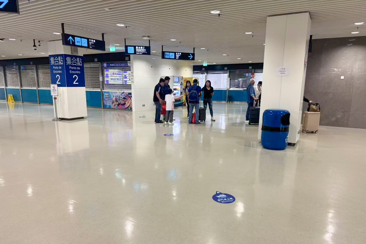 外港客运码头海上游的集合点位于码头地面层入境大堂西翼,即进入入境大堂后靠右侧“集合点2”位置。为了让市民和旅客清晰海上游集合点的位置,海事及水务局于2024年第四季进行外港客运码头空间优化工程时,已于地面层的地板贴上海上游指示标识,指引市民和旅客前往集合点。