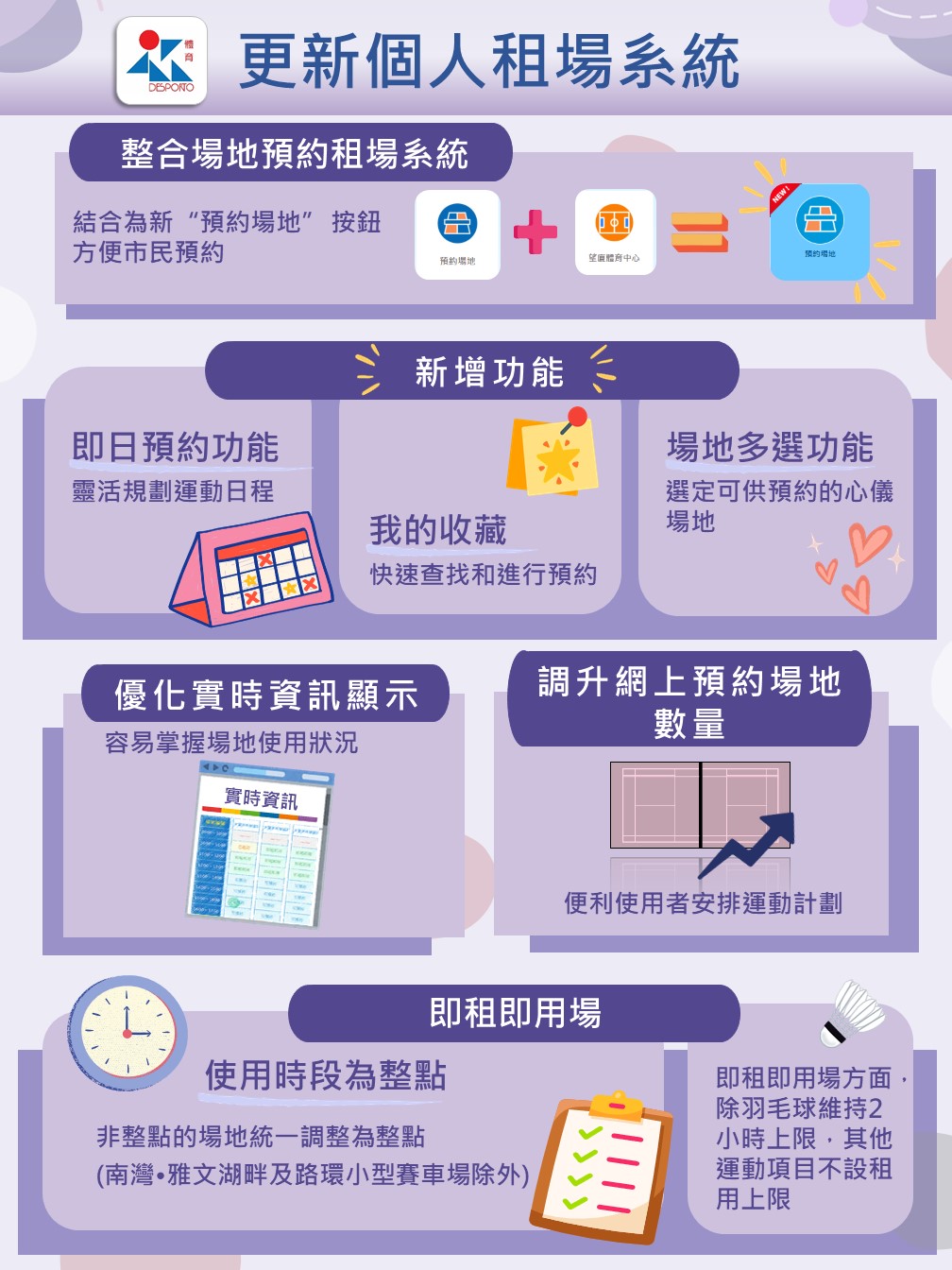 为提升市民使用体育局辖下体育设施的体验,体育局于2025年6月20日起更新个人租场系统,将多方面优化租场界面及功能,让市民能够更便捷地预约体育设施,提升个人化的操作体验。此外,体育局亦对现行的租场措施进行优化及调整,包括新增网上即日预约服务、统一体育设施的租场时间为整点、调升预约场地数量比例、以及统一各体育设施的每日租用时数上限等,进一步便利市民规划运动日程。