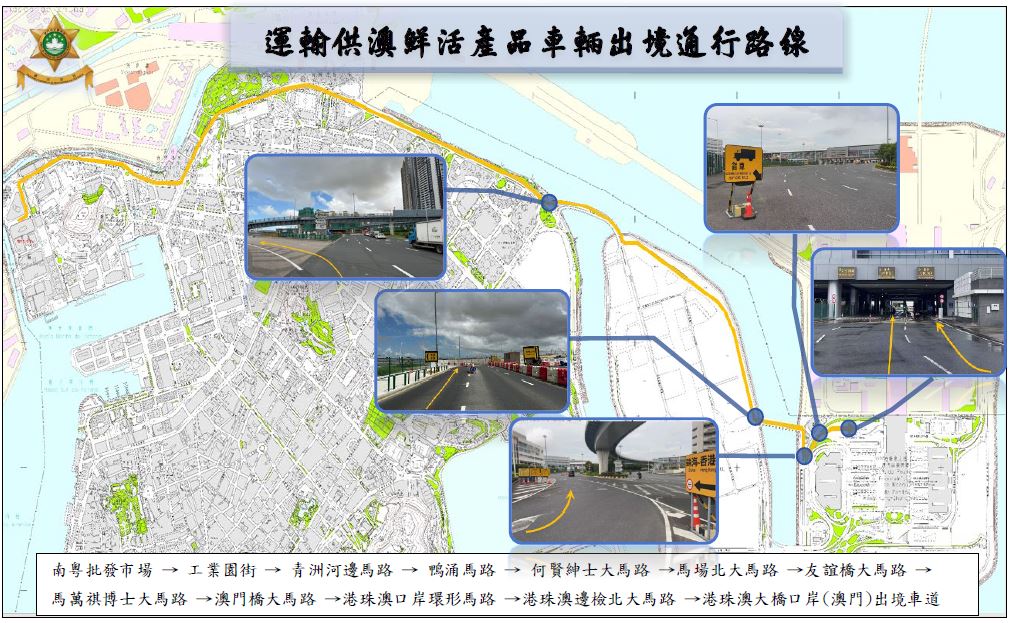治安警察局呼吁:运输供澳鲜活产品车辆驾驶者应提前了解和熟悉通行路线(详见附图),注意交通安全,车辆于口岸通关离境时,应遵从现场警员指示,配合出境查验有序通行,同时可透过治安警察局「出入境事务站实时资讯平台」及交通事务局手机应用程式掌握口岸车流及道路交通实时情况。