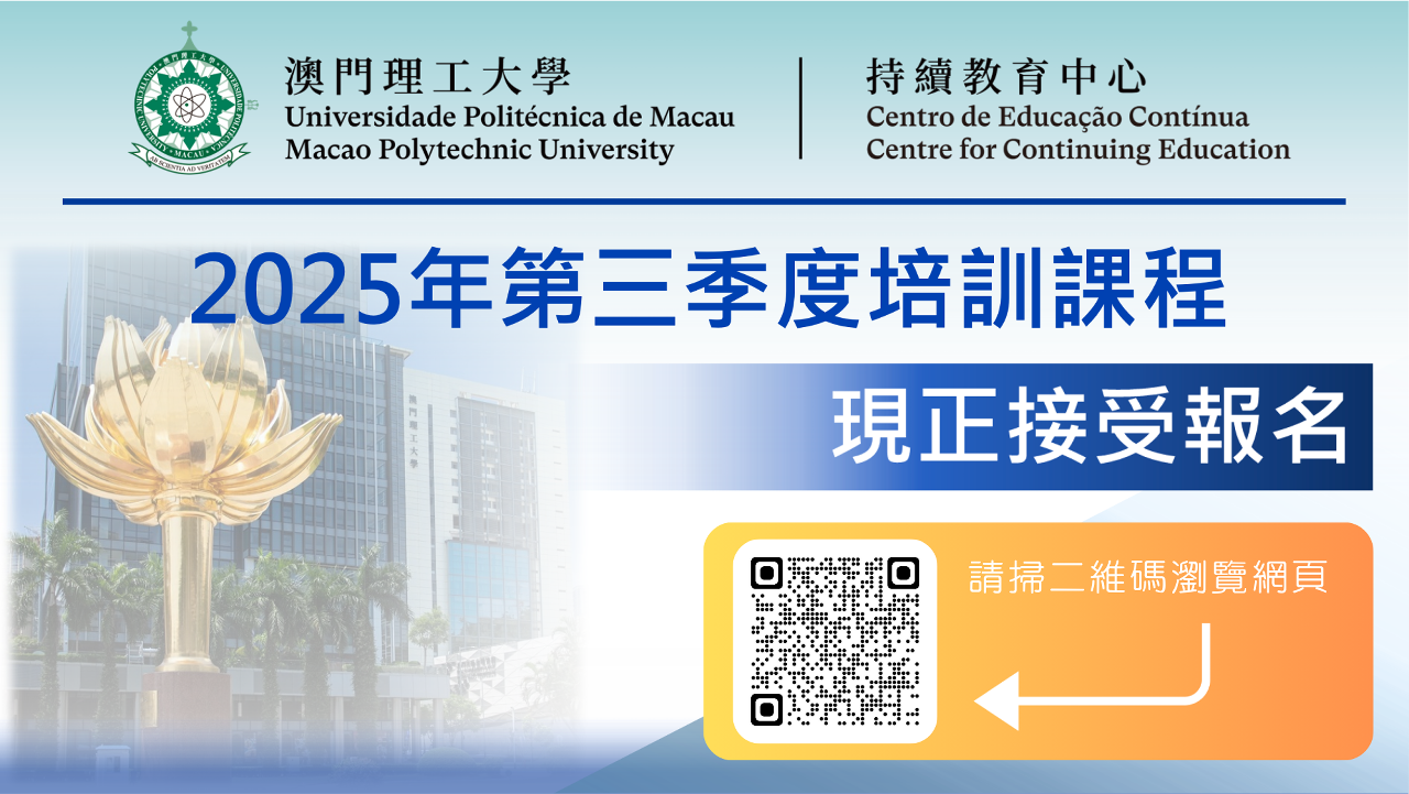 为促进澳门经济适度多元发展,致力培育专业复合型人才,澳门理工大学持续教育中心将于2025年第三季度开办50多项专业培训课程,范畴涵盖金融科技、公共行政、社会工作、商业应用、语言传意、科技及工程、旅游与会展、护理、青少年培养,以及艺术及设计等领域。课程现正接受报名,欢迎社会各界人士报读。