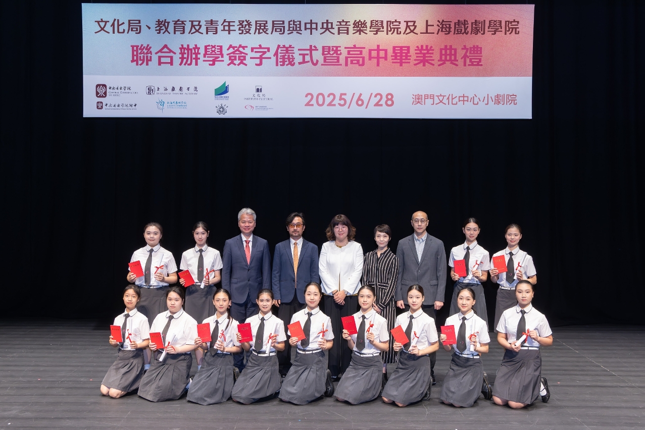 文化局、教育及青年发展局与中央音乐学院及上海戏剧学院于6月28日在澳门文化中心小剧院举办联合办学签字仪式,并同日举行文化局澳门演艺学院舞蹈学校第八届舞蹈职业技术高中毕业典礼,以及音乐学校第十二届音乐职业技术高中毕业典礼,一众嘉宾、师生、家长出席及见证。
