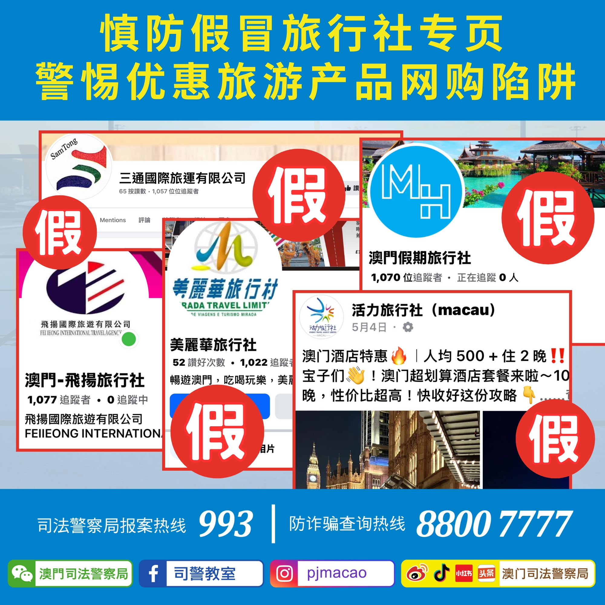 近日司法警察局发现骗徒于Facebook 假冒「活力旅行社」、「美丽华旅行社」、「飞扬旅行社」、「澳门假期旅行社」、「三通国际旅运」等专页发布广告,企图以优惠价促销自助餐券、酒店客房等旅游产品诱骗市民以「先付款、后取货」进行交易,并以假冒旅行社名义开设且未经认证的MPay二维码收款,当市民付款后骗徒将会随即失联。