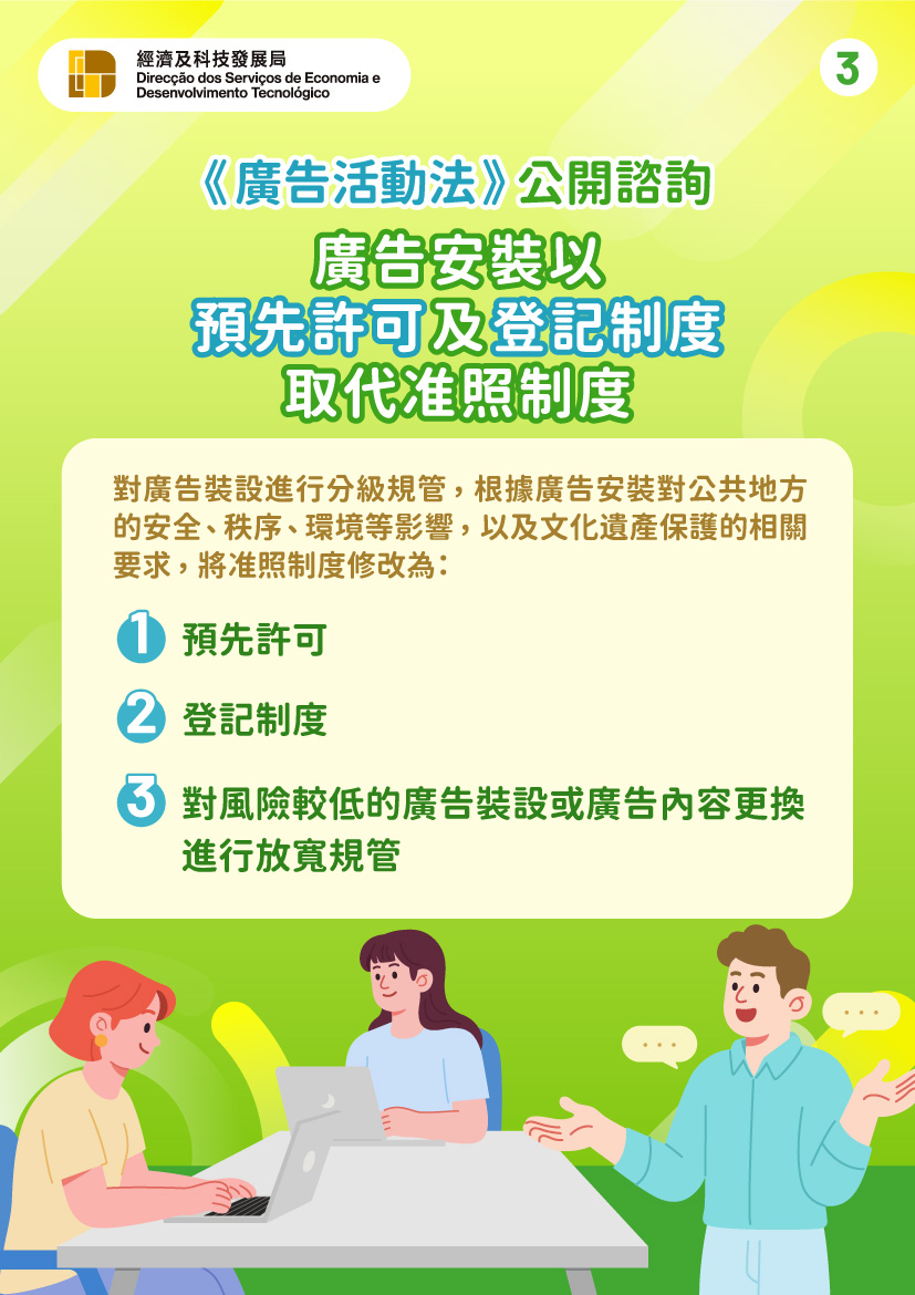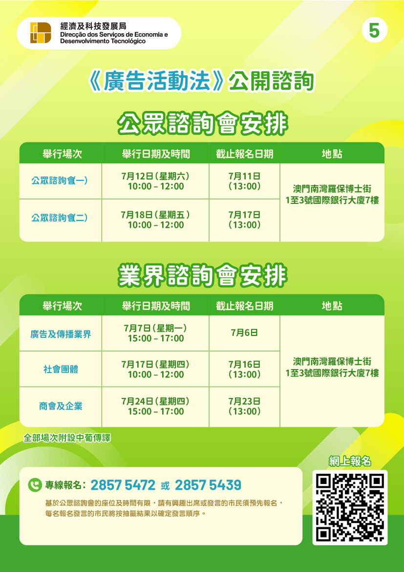 此外,经科局于咨询期将举办5场咨询会(详情请参阅图文包),向社会各界介绍公开咨询的内容,有意了解详情或参加的人士,可透过专页、扫描图文包二维码或于办公时间致电28575472或28575439查询或报名。