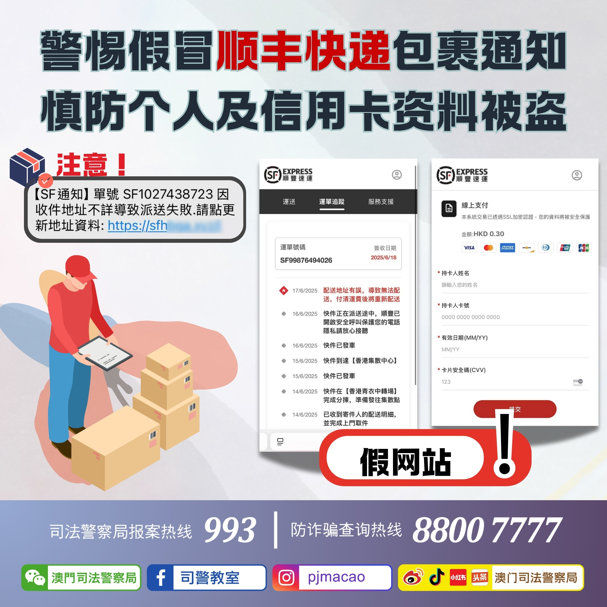 司法警察局近日接到有多名市民提供犯罪消息,指收到假冒顺丰快递公司的诈骗钓鱼短讯。骗徒假冒顺丰快递公司向事主发送手机短讯,讹称事主有包裹因收件地址有误以致派送失败,需透过短讯附带之连结更新资料。当事主点击连结后会跳转至一个假冒快递公司之钓鱼网站,并以更新地址及补缴运费为由诱骗事主输入个人及信用卡资料、一次性交易验证码以进行未经授权之大额交易。