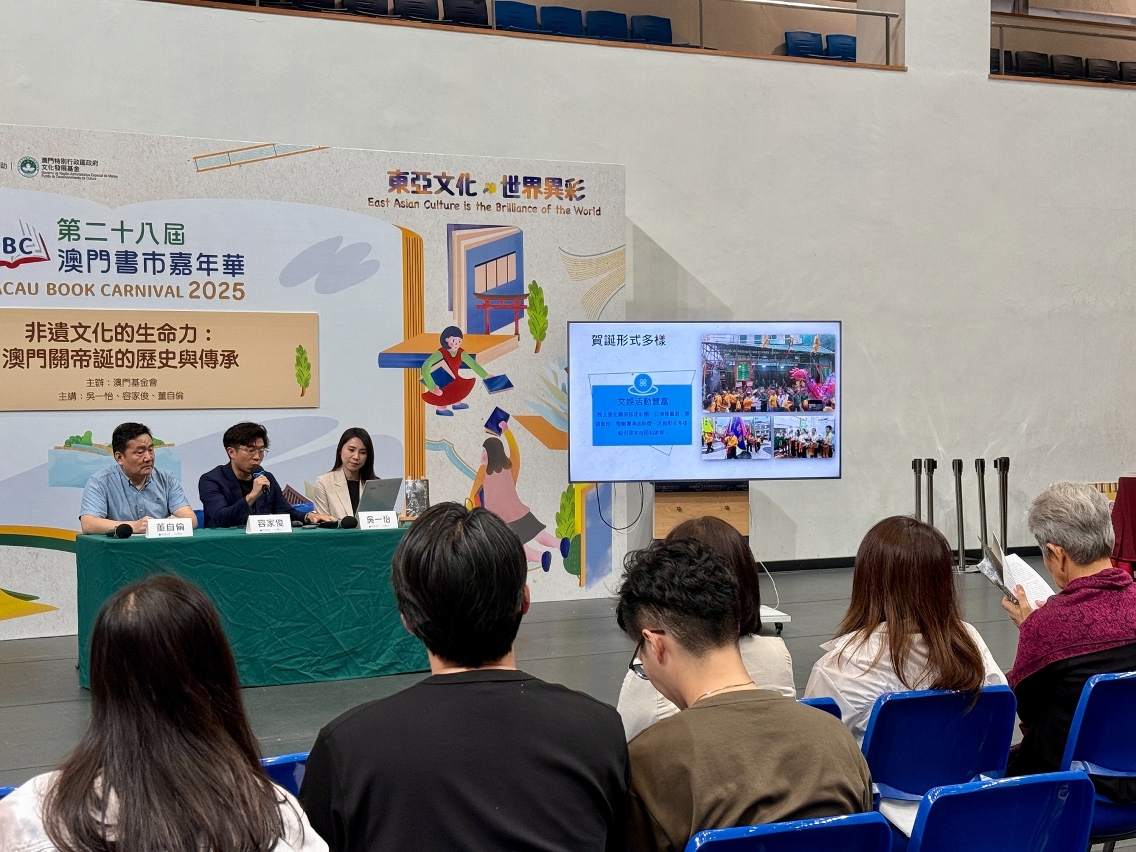 澳门基金会主办的 “非遗文化的生命力:澳门关帝诞的历史与传承” 讲座,已于2025年7月12日下午六时半至七时半假澳门理工大学体育馆 “第二十八届澳门书市嘉年华” 举行。讲座邀请了《澳门关帝诞》作者吴一怡、容家俊、董自伦亲临书展现场主讲,共话澳门关帝文化传承发展,吸引众多澳门历史文化爱好者和市民到场参与,场面热闹。