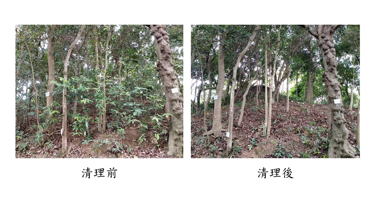 为维护松山市政公园林区的健康及丰富林区的生物多样性,市政署开展清藤护林工作,主要清理藤蔓、移除枯木、健康状况不良的危树及入侵种树木。清除缠绕及覆盖树木的藤蔓植物后,能减少原有树木被绞杀及压迫的情况,让幼苗、灌木及草本获得更多生长空间和光照,增加了林下植被的多样性。同时,改善林内通风透光,减少害虫栖息及繁衍,从而降低病害风险。