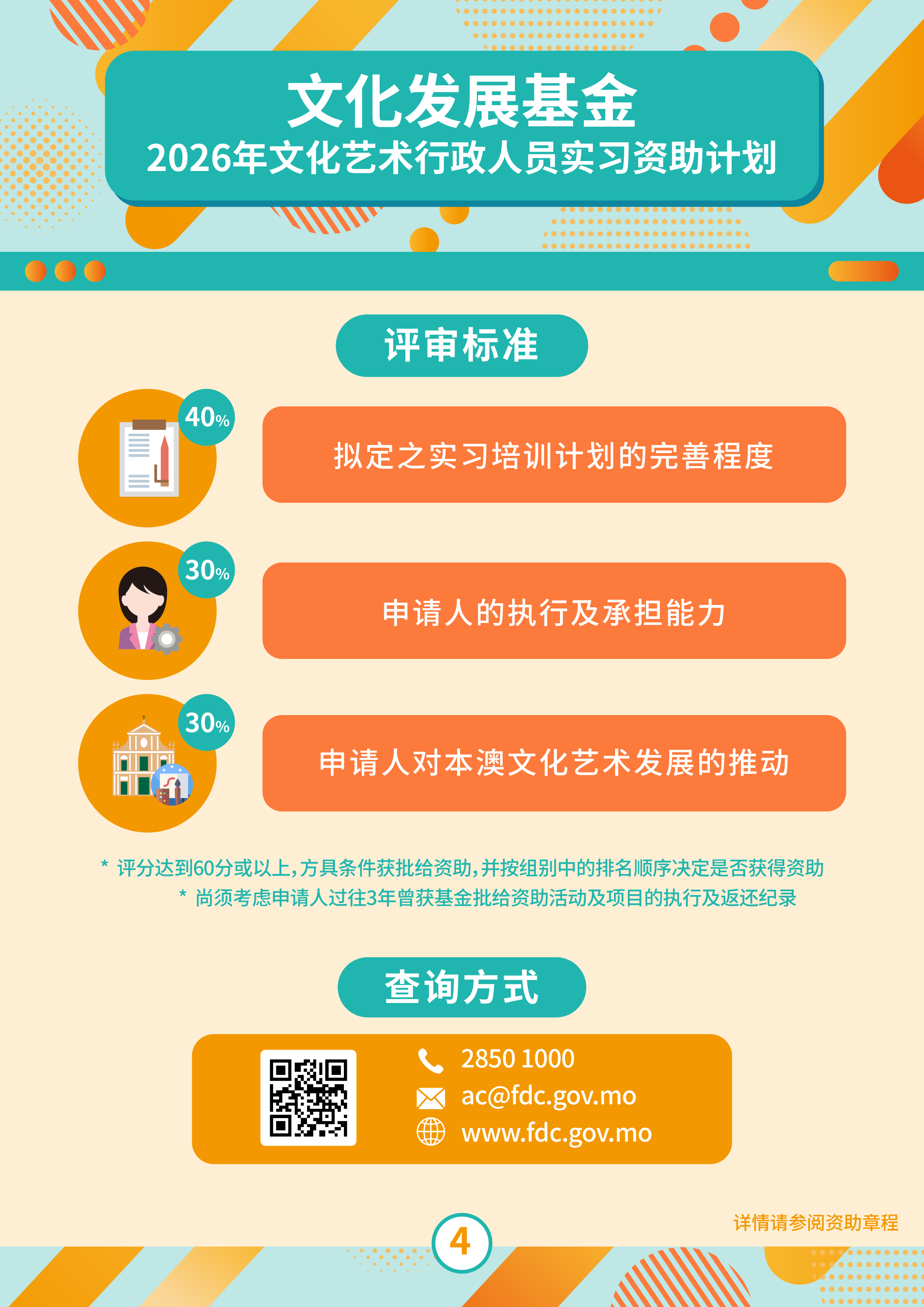 有意申请人可透过基金网页(www.fdc.gov.mo)浏览申请详情,如有疑问,欢迎致电2850 1000或电邮ac@fdc.gov.mo。