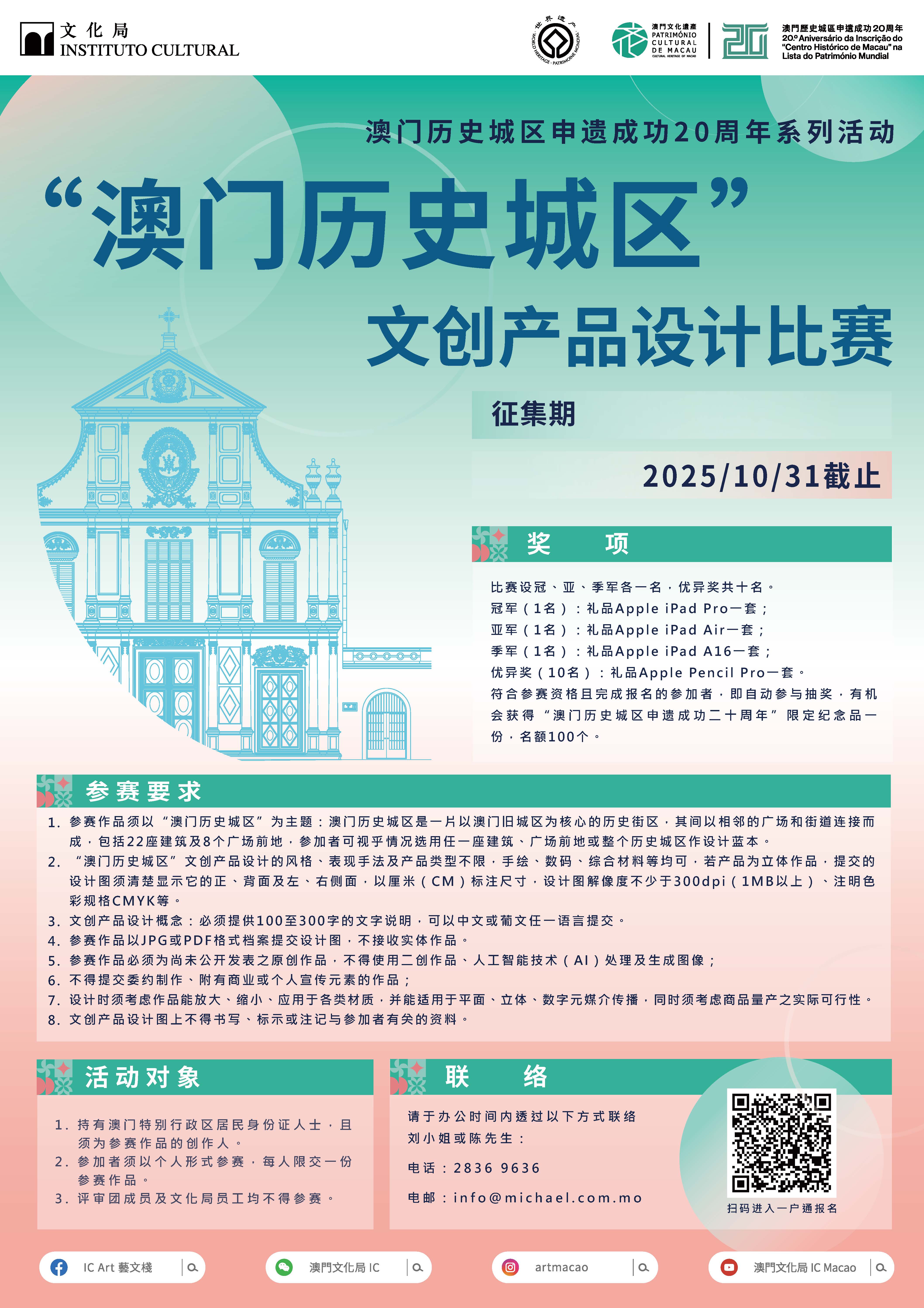 为鼓励澳门居民深入认识和挖掘澳门世界遗产价值,传达“世遗共享”理念,激发文化传承与创新活力,文化局藉“澳门历史城区”申遗成功20周年,推出“澳门历史城区”文创产品设计比赛,征集期由即日起至10月31日,欢迎各界踊跃参与。