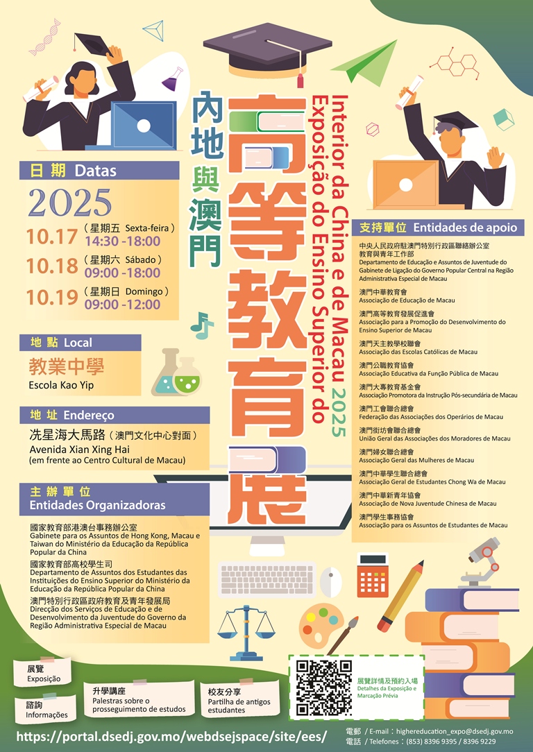 国家教育部港澳台事务办公室、高校学生司与澳门特别行政区政府教育及青年发展局将于2025年10月17至19日举办“内地与澳门高等教育展2025”。展览将以实体展览为主,并配合专题网页展示高校资讯。参展高校将于教业中学为参加者现场解答疑问,同时,展览期间将举办一系列不同主题的升学讲座,及邀请曾于不同地区升学的校友分享经验,为有意于澳门及赴内地升学的学生、其家长和老师全方位了解内地和澳门的升学资讯。