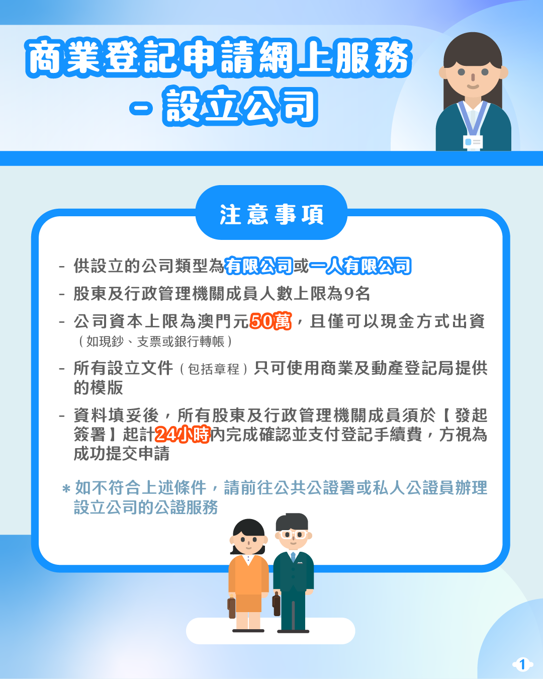 有意设立公司的人士可透过“商社通”提交公司设立的申请,并使用预设格式的线上文件模版制作公司设立的各类文件,无须再亲临公证署及登记局,即可轻松完成公司设立程序,提高企业开办效率。此外,变更公司地址也可透过“商社通”办理,包括提交申请、缴付登记费及取得登记副本,继续实现指尖办事模式,为用户带来最大便利。