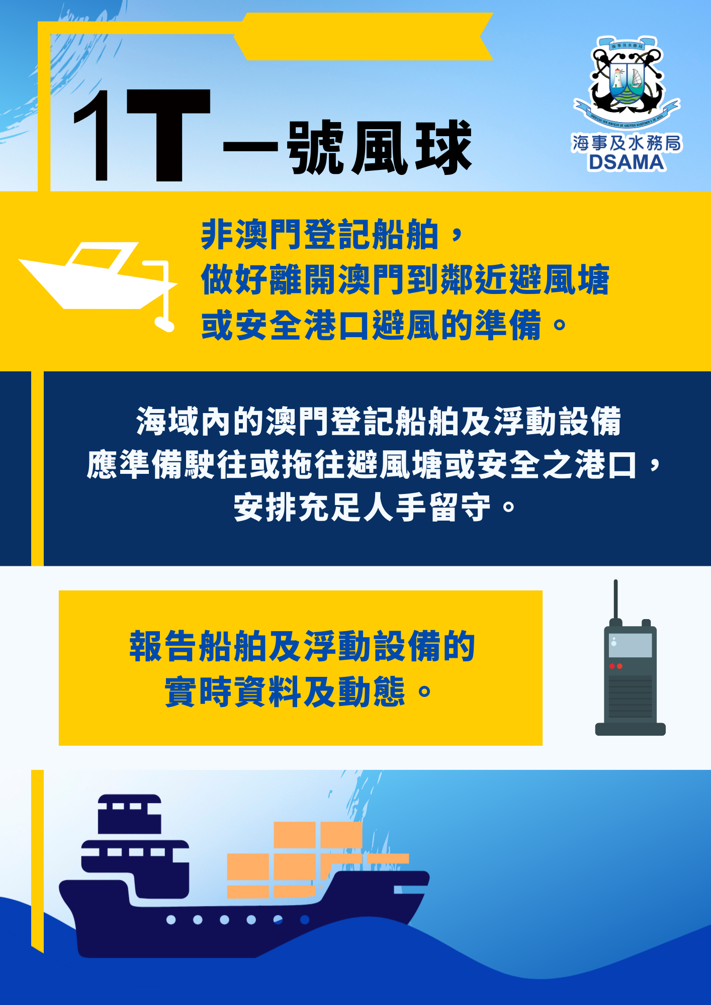 随着热带气旋进一步靠近,本澳天气可能逐渐转差,尤其三号风球时会有大量船只驶入内港锚地避风,业界应及早做好避风安排。工程船在三号风球时必须撤离施工区域,渔船亦应及早回澳避风,预留充足回航时间,确保船只安全和系稳绳缆,严防因恶劣天气及风暴潮造成的安全威胁或货物损失。如有需要,海事及水务局也会按照内港临时防洪措施预警通报机制,通知内港码头的联络人安装防水旱闸。