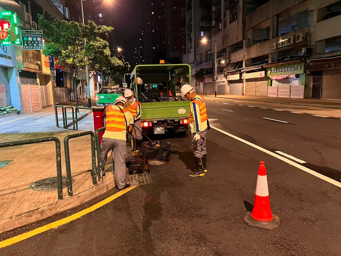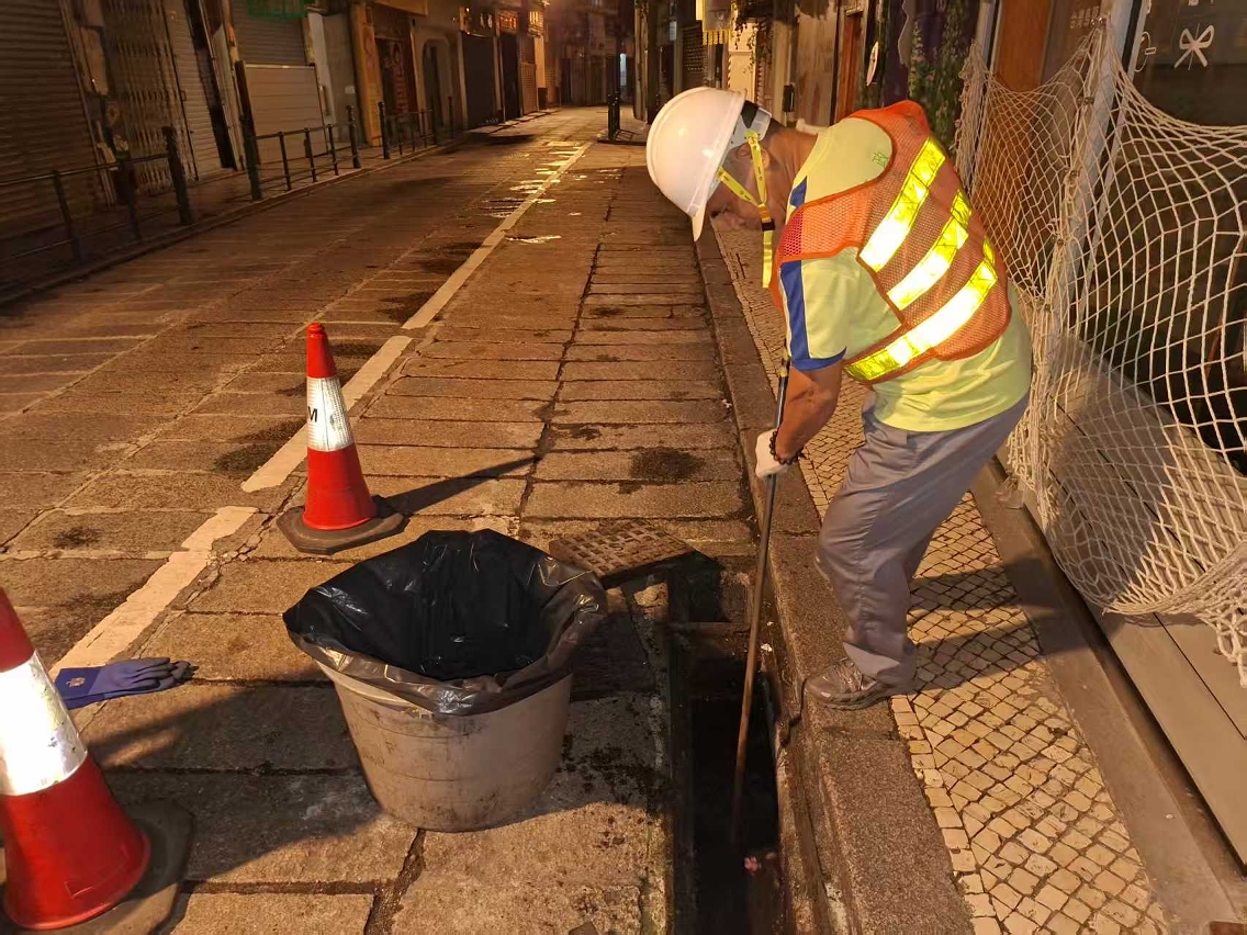 市政署持续派员,在安全情况下于在本澳各区清理渠网及集水井,避免杂物垃圾阻塞渠口影响排水。