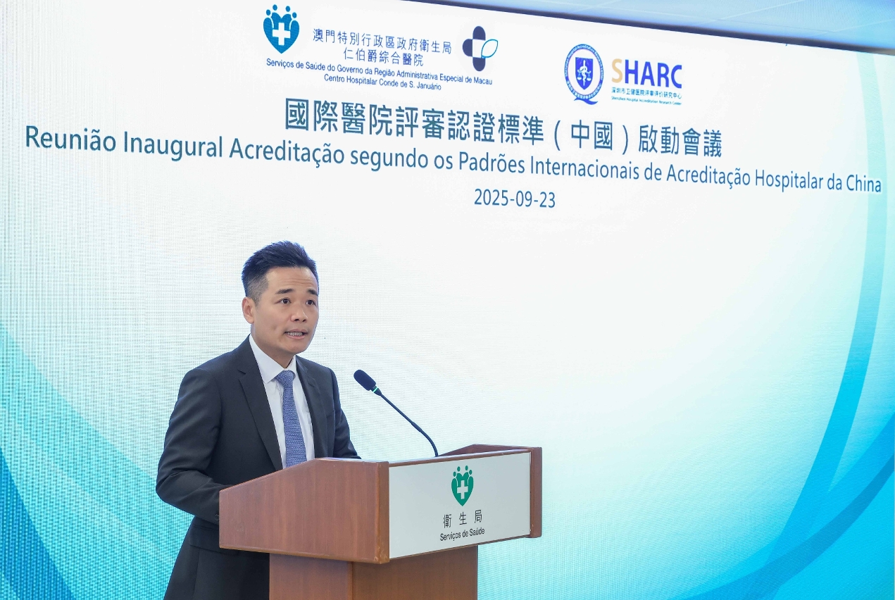 罗奕龙局长在会议上致辞时表示,医院认证是提升医疗质量和保障病人安全的重要手段,深圳市卫健医院评审评价研究中心制定的《国际医院评审认证标准(中国)》已获国际医疗质量协会认证,成为国家首个获国际认证的医院评审标准。今年初,在国务院港澳事务办公室、中央人民政府驻澳门特别行政区联络办公室和国家卫生健康委员会的指导下,在社会文化司的大力支持下,特区政府积极推进认证工作,卫生局仁伯爵综合医院率先开展筹备,目标是争取在2026年内顺利通过认证,而协和澳门医学中心及镜湖医院亦将启动此认证程序。他指出,参与认证具三方面意义:一是依据国家制定的国际标准提升本澳居民就医的质量与安全;二是促进本澳与大湾区医疗机构同质化发展,推动本澳进一步融入国家发展大局;三是凭藉本澳“一国两制”优势及与葡语系国家的紧密联系,助力国家医院评审认证标准不断走向世界,拓展医疗领域国际化工作。