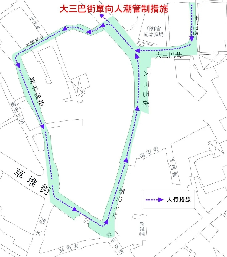 大三巴街单向人潮管制措施当大三巴街(手信街)人群出现挤拥时,将会实施单向人潮管制措施,人流只可单向上行往牌坊,并取道周边的街巷如大关斜巷、关前后街、高园街等离开。另外,在有需要时,会在女娲庙位置同时实施分仓分流措施(详见附图五)。