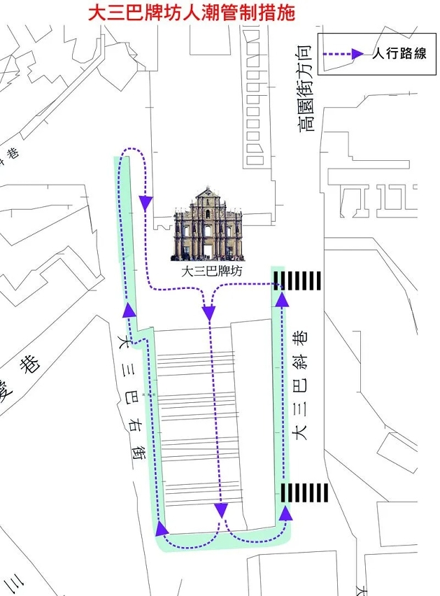大三巴牌坊人潮管制措施,当大三巴牌坊范围人群出现挤拥时,该区域会采取管制措施,市民和旅客可从牌坊脚两边小路上行抵达牌坊,而牌坊梯级只准下行(详见附图六)。