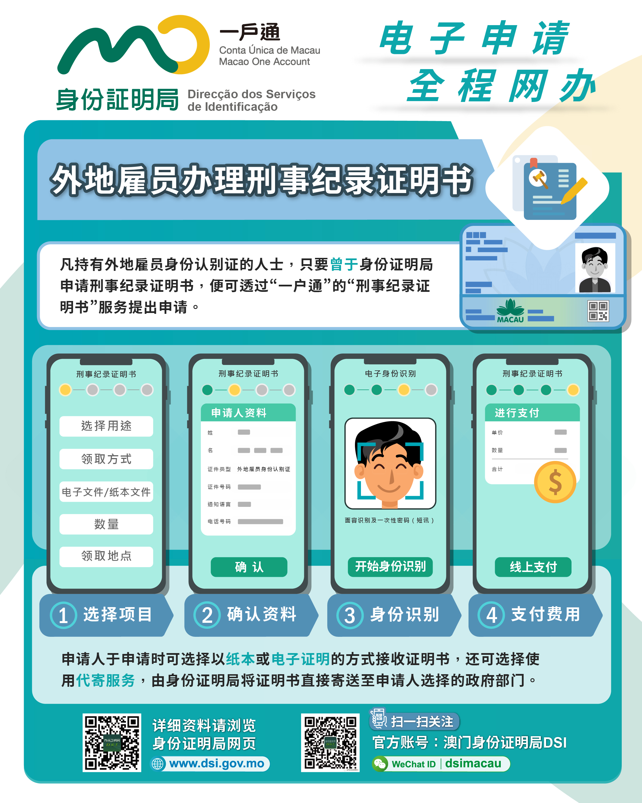 有关服务详情,请浏览身份证明局网页(www.dsi.gov.mo)。如有查询,请致电身份证明局热线(2837 0777或2837 0888)或电邮至info@dsi.gov.mo。