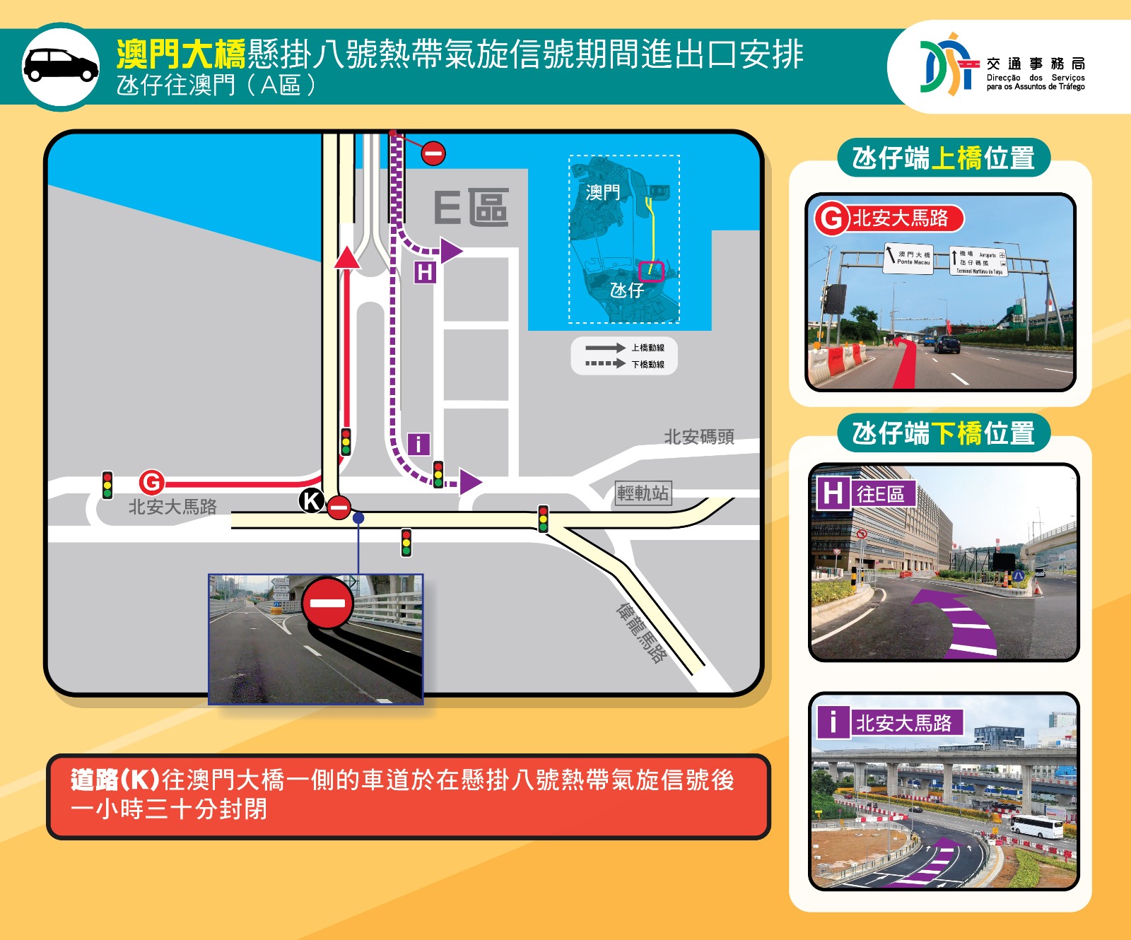 为保障恶劣天气下市民必要的跨海出行需要,经跨部门协调,特区政府将在8号风球期间,开放澳门大桥供有限度通行(详情请查阅附表),但如热带气旋的强度、风暴潮水位、降水量及风力等因素构成足以妨害公共安全的风险,民防联合行动指挥官可随时禁止轻型客车在澳门大桥通行,敬请市民留意及注意安全。